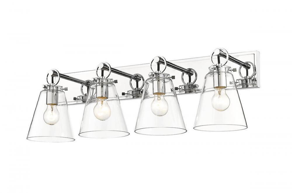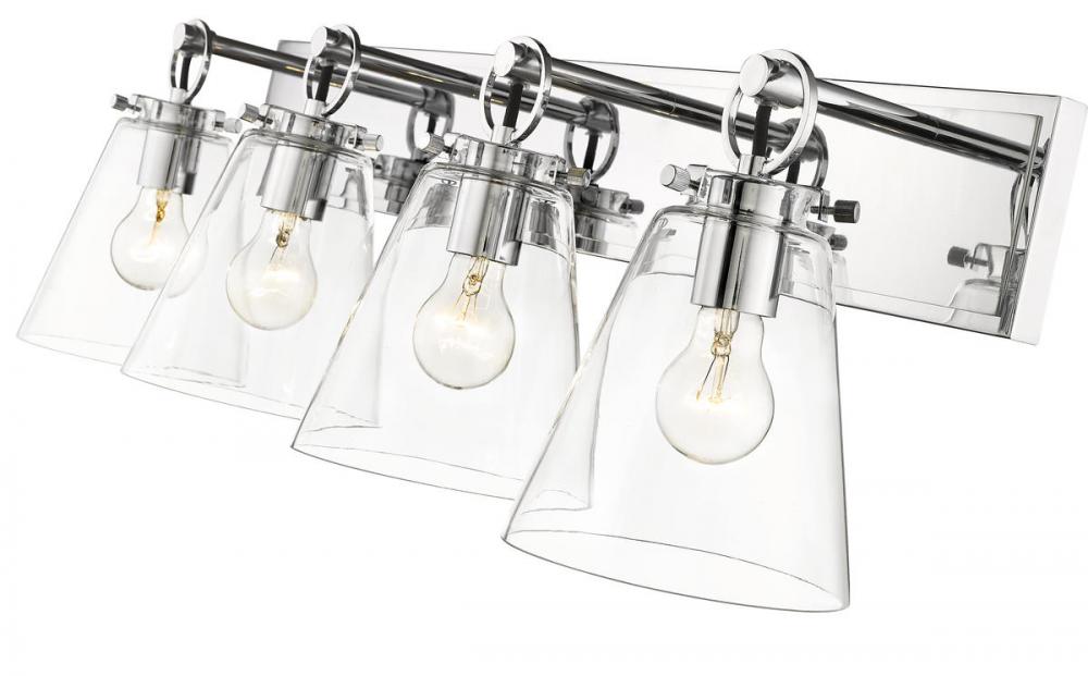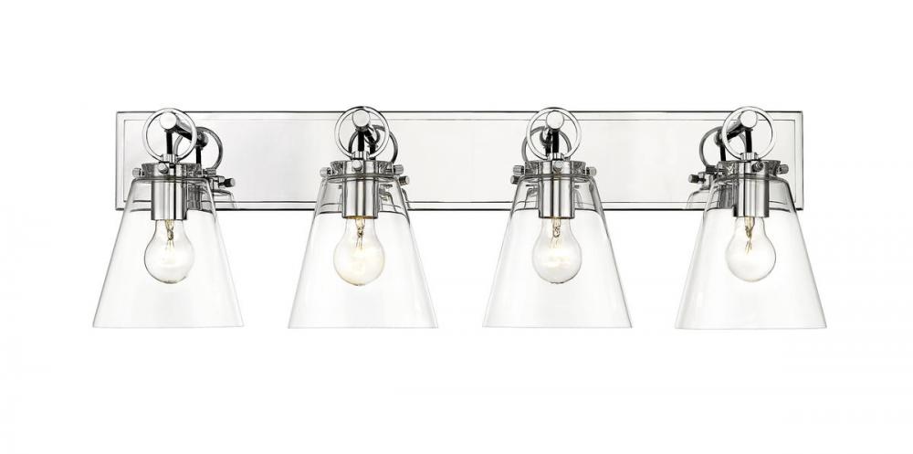 This modern four-light vanity bath light captures a sophisticated aesthetic with nautical inspiration, perfect for an upscale custom bath space. Indulge in delicate conical shades made of clear glass and a shiny chrome finish wall mount updated with charming ring and peg accents. Perfect for a mid-sized to larger vanity, this light becomes a focal point.