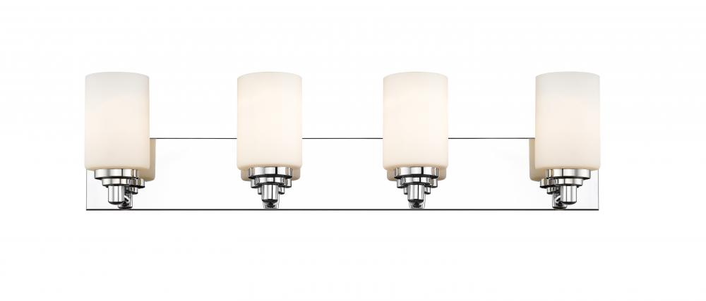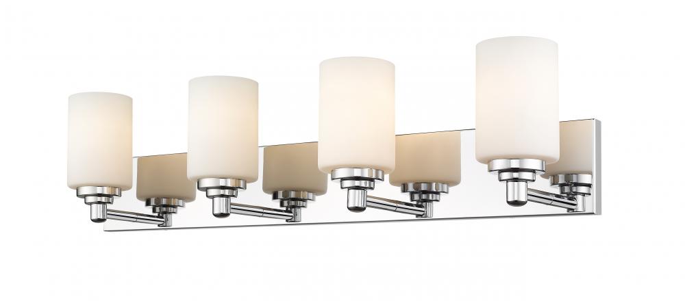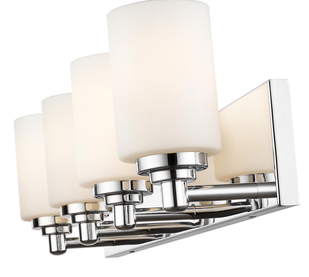 Let your bathroom or hallway bask in soft, warm light. This contemporary four-light wall sconce has a sophisticated, streamlined look, and extends from a long mirrored plate for extra gleam. From the sconces cylindrical white etched glass shades to its chrome finish, this fixture stylishly upgrades your space.
