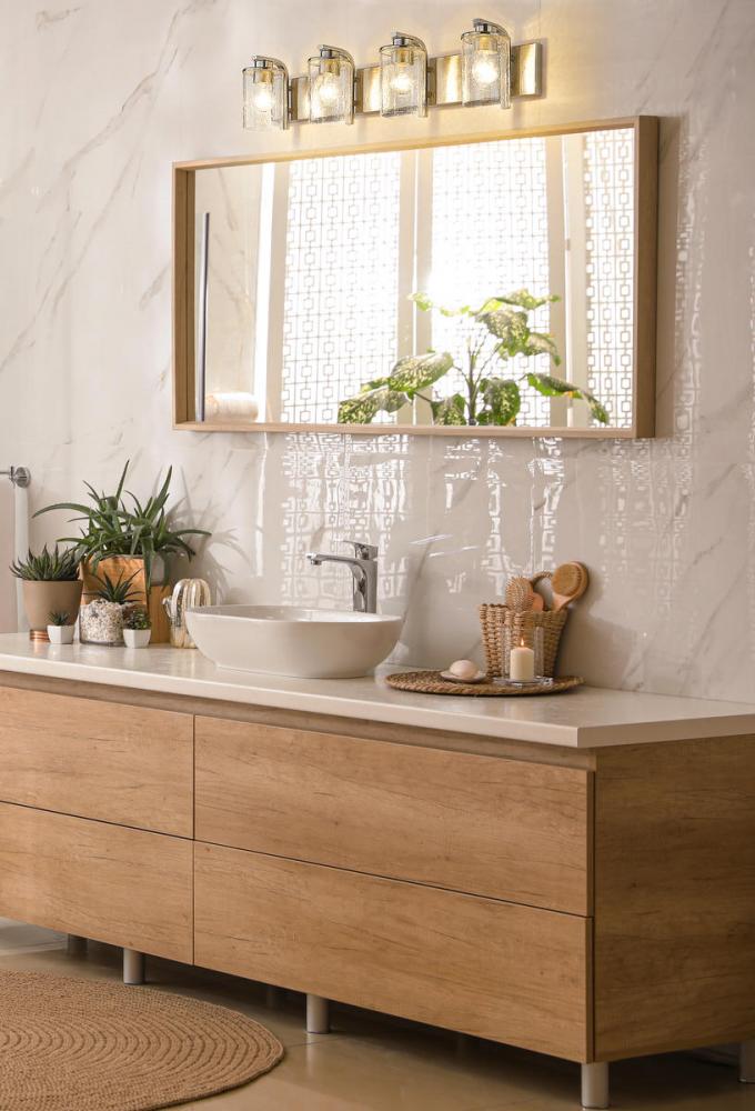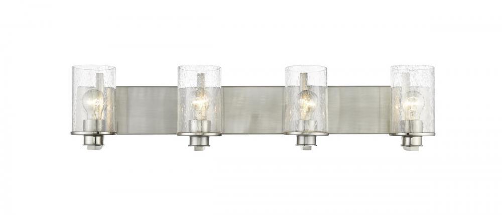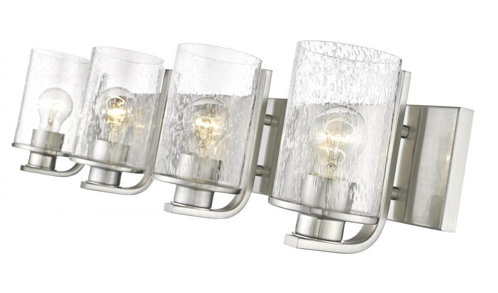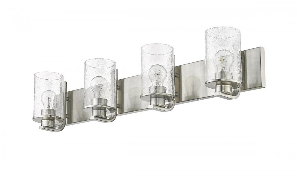 This four-light vanity light from the Beckett collection offers a minimalist look with customized materials. Create a sophisticated aesthetic in a mid-sized bath or dressing space with a fixture formed of classic brushed nickel finish steel and highlighted with the romantic look of cylindrical clear seedy glass shades.