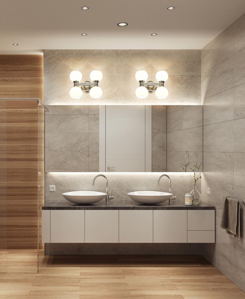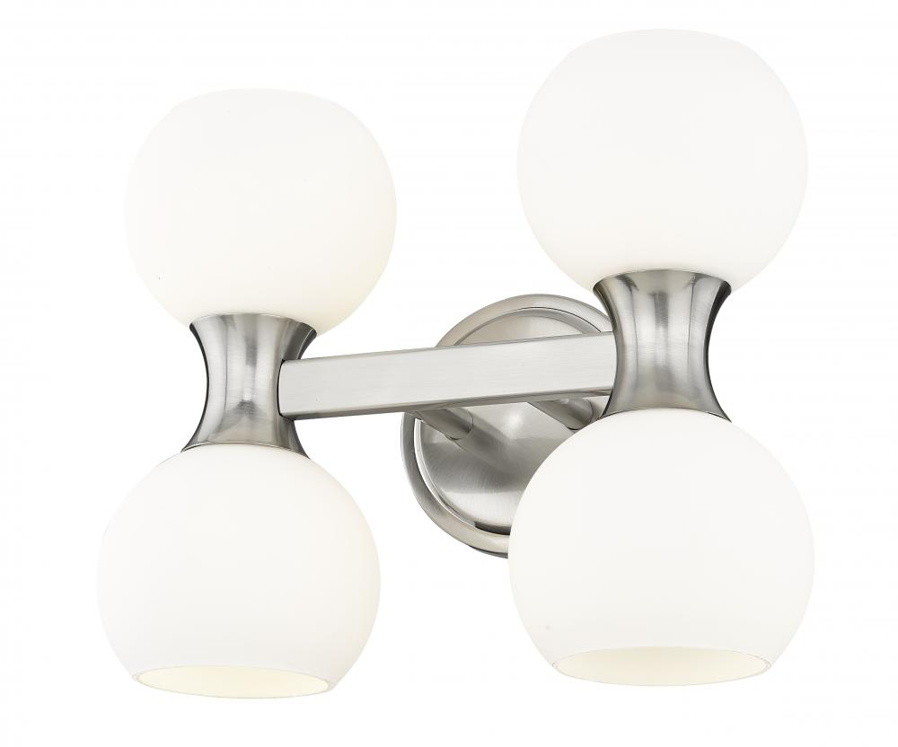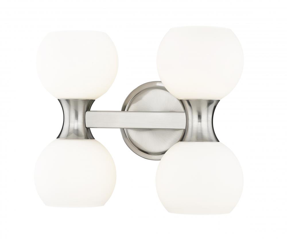 Follow the subtle yet alluring curves that gently shape a festive look in a light fixture with timeless style. From the Artemis collection comes a four-light vanity light with design creds that boost the custom look of an ensuite or guest bath. A Mid-Century motif is updated to reflect contemporary flair with a shapely brushed nickel finish steel frame and wall mount and delicate matte opal glass shades, all created to attract attention from floor to ceiling.