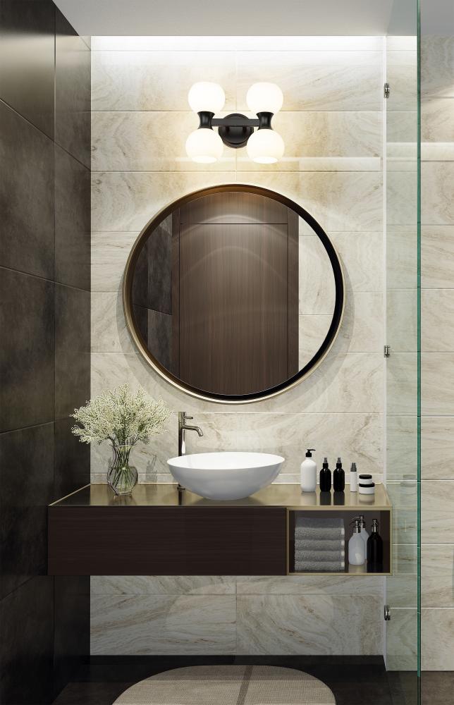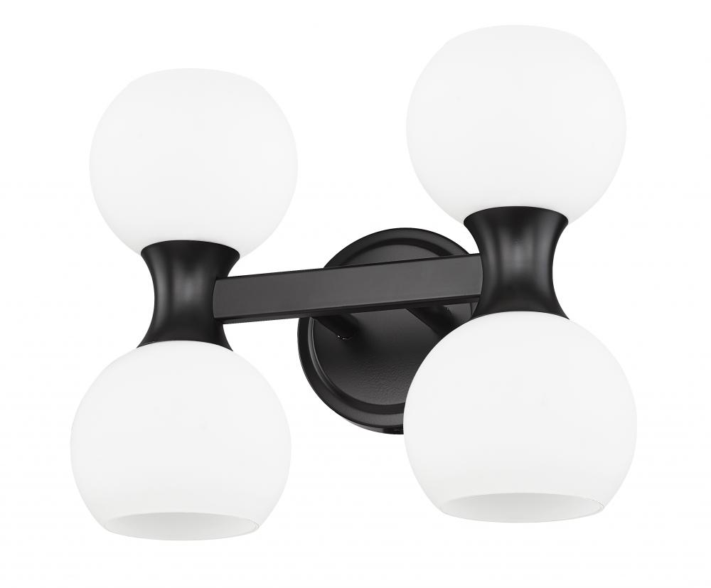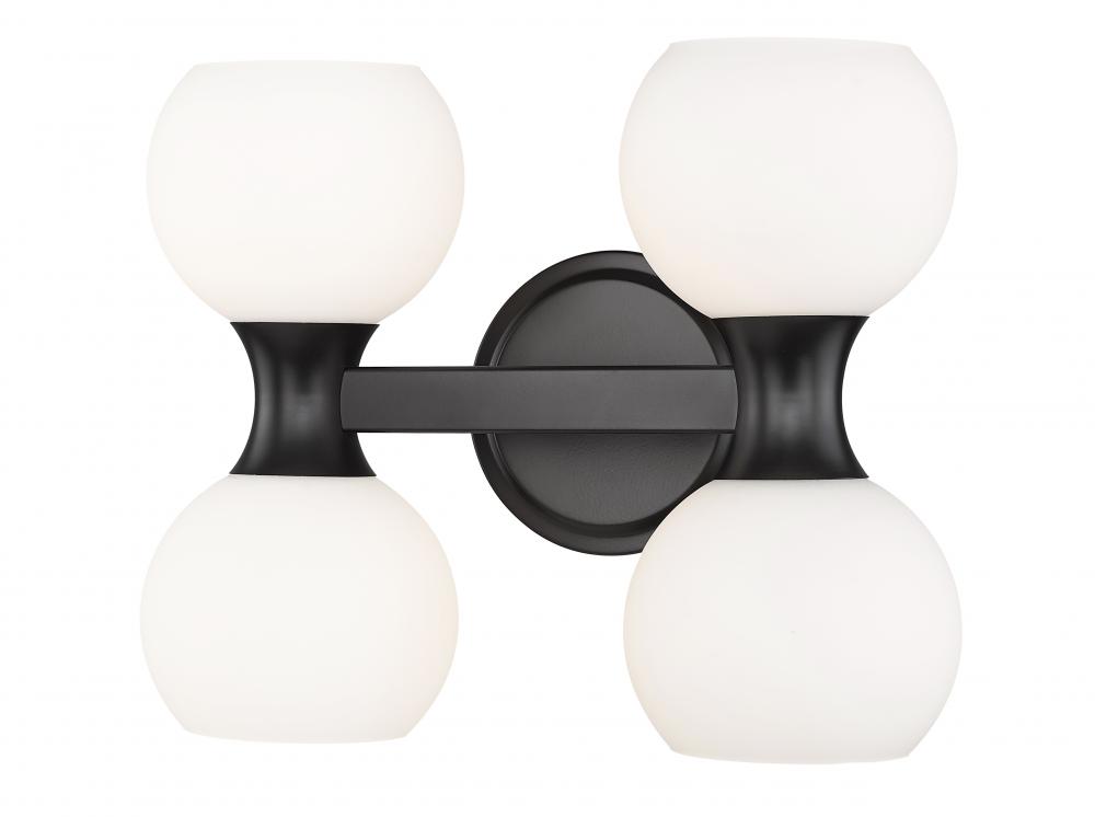 Freshly inspired with a contrasting finish palette and festive aesthetic, this light fixture is a solid choice for a bath or living space in need of strong ambient lighting. From the Artemis collection comes a four-light vanity light with design creds that boost the tasteful look of an ensuite or guest bath. A Mid-Century motif is updated to reflect contemporary flair with a shapely matte black finish steel frame and wall mount and delicate matte opal glass shades, all created to attract attention from floor to ceiling.