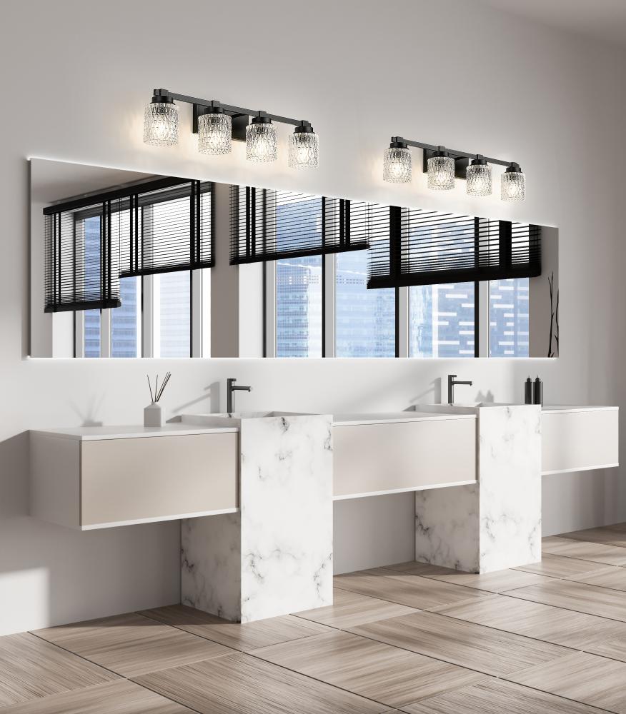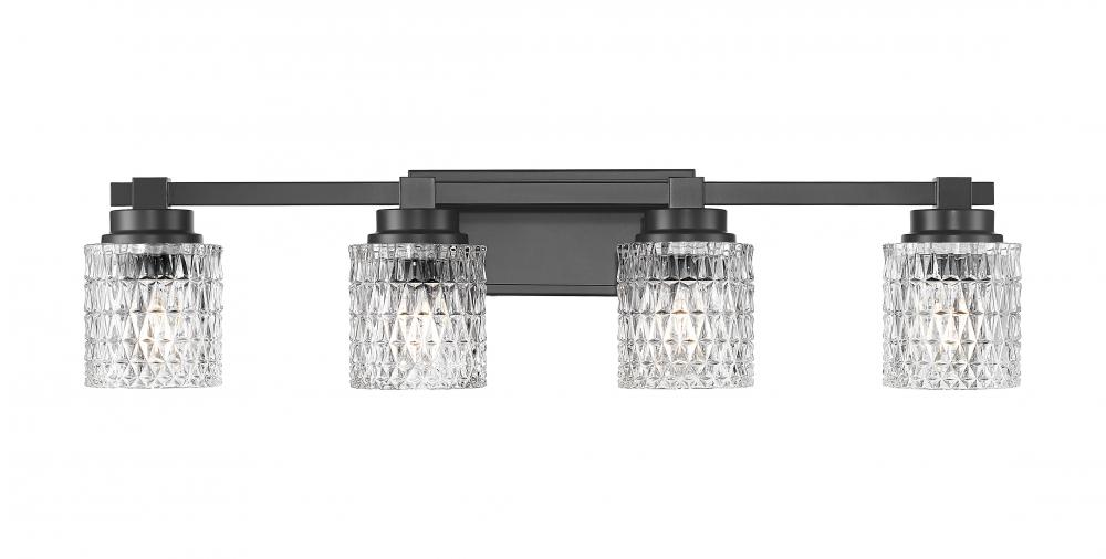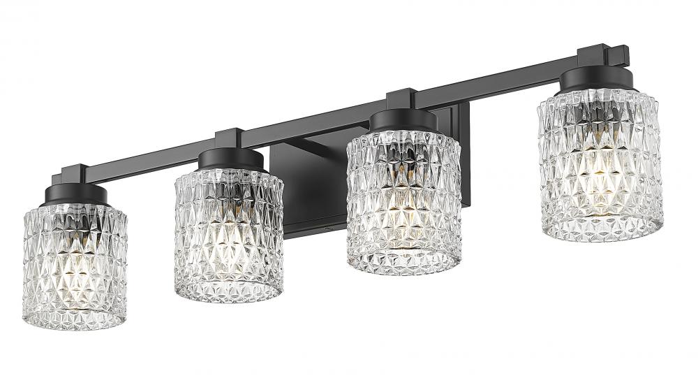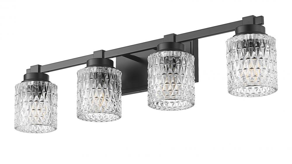 A dramatic look puts a new spin on sophisticated glam lighting as this four-light vanity light begins with bold matte black finish steel framing. Its suspended clear glass shades with textural diamond patterning deliver a chic look with understated beauty, as convenient dimming functionality creates various selectable light levels.