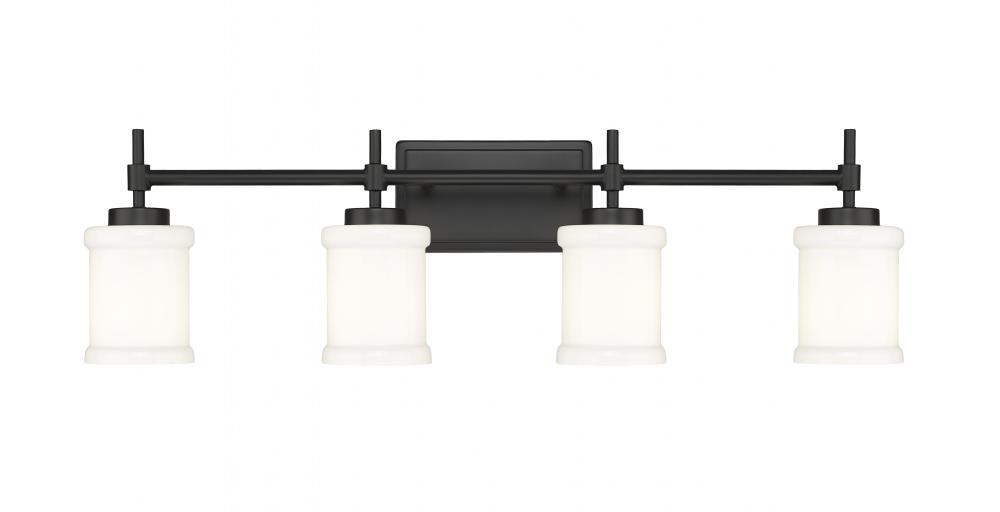 Embrace moody ambiance with the rich texture and strong matte black finish of a modern four-light vanity fixture. A statement piece in any bath, it boasts a straight arm with decorative posts and a trimmed wall plate. Four cylinders of glossy white glass diffuse illumination while delivering added depth with cuffed details that bring refined character.