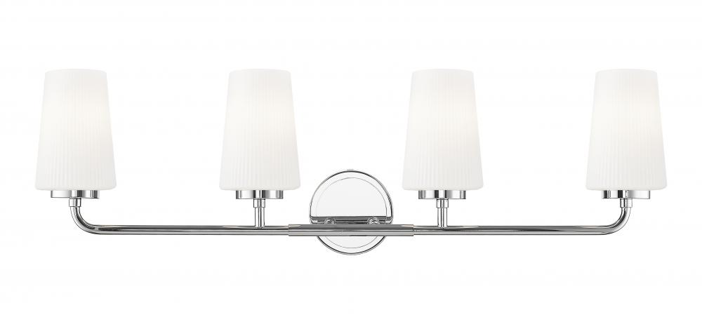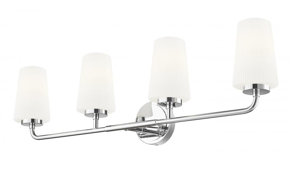 Center relaxed sophistication in your bath with this modern four-light vanity wall light. In chrome, it features a clean, simple silhouette that imparts a hint of industrial or restoration design flair. Ribbed opal glass shades are tall and tapering, creating a striking silhouette while gently diffusing illumination for all your morning and evening needs.