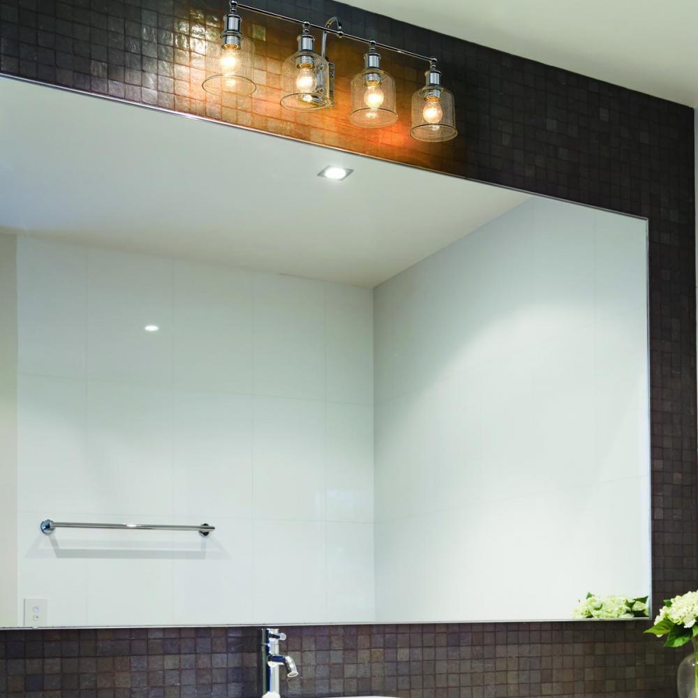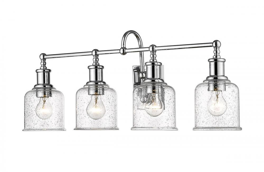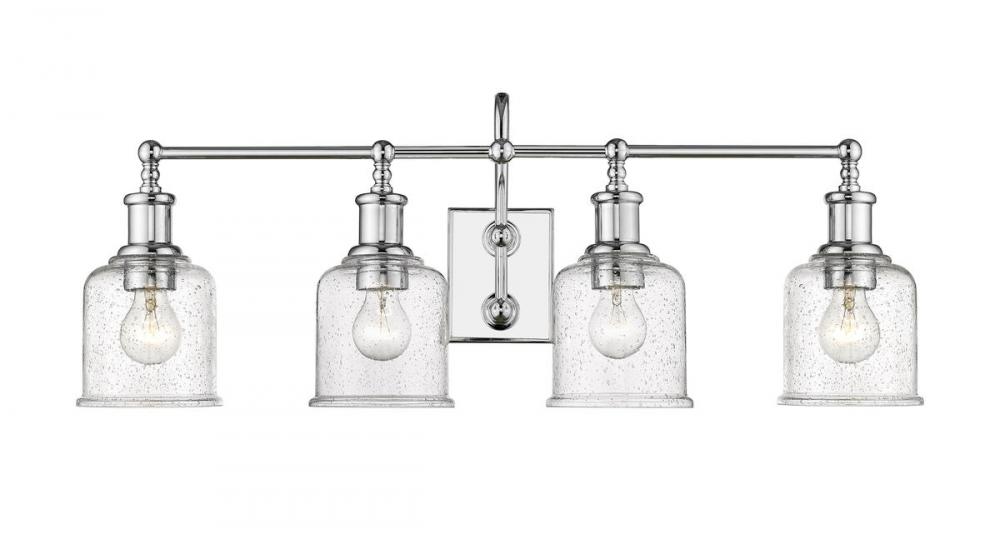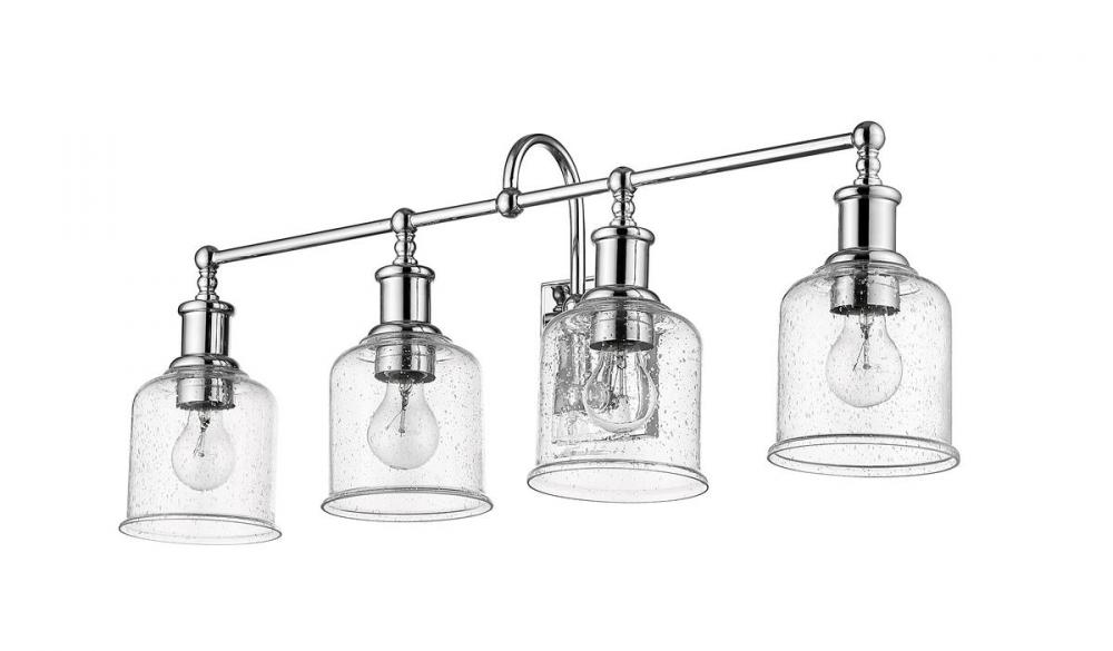 Village-inspired charm borrows from a nautical theme to create an inspiring look for traditional and transitional bath spaces in this four-light vanity from the Bryant collection. With a brilliant chrome finish steel frame and wall mount, its romantic clear seedy glass shades blend with beauty. A curved arm, ornate holders, and lipped shades generate extra charm that stylize a custom bath space.