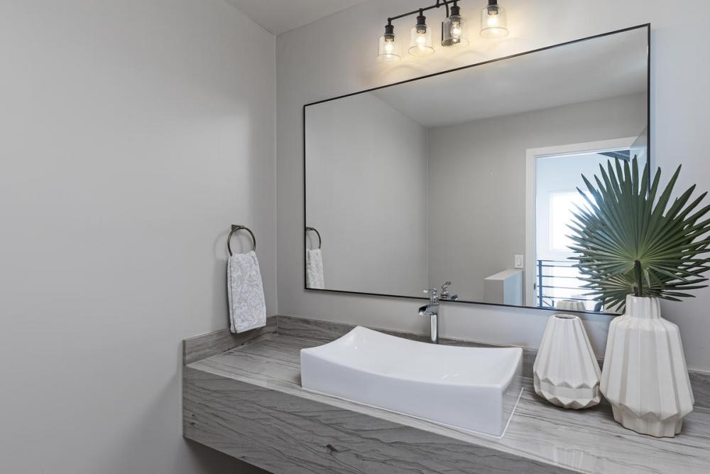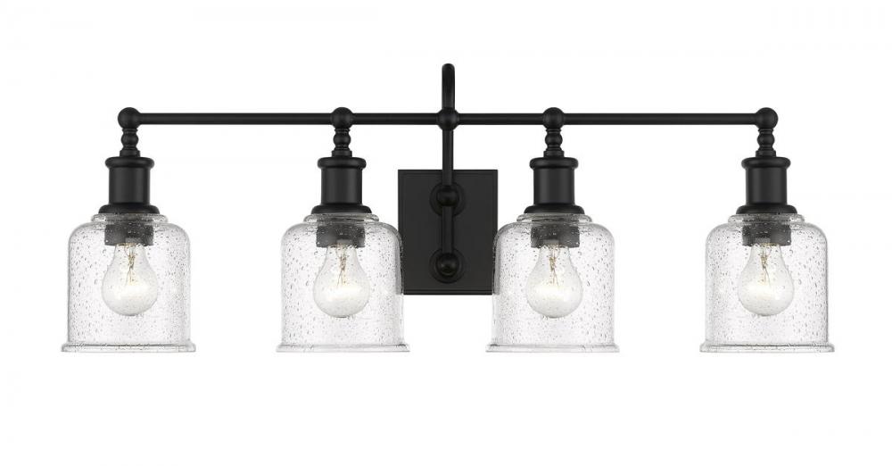 Village-inspired charm borrows from a nautical theme to create an inspiring look for traditional and transitional bath spaces in this four-light vanity from the Bryant collection. With a bold matte black finish steel frame and wall mount, its romantic clear seedy glass shades offer tasteful contrasts. A curved arm, ornate holders, and lipped shades generate extra charm that stylize a custom bath space.
