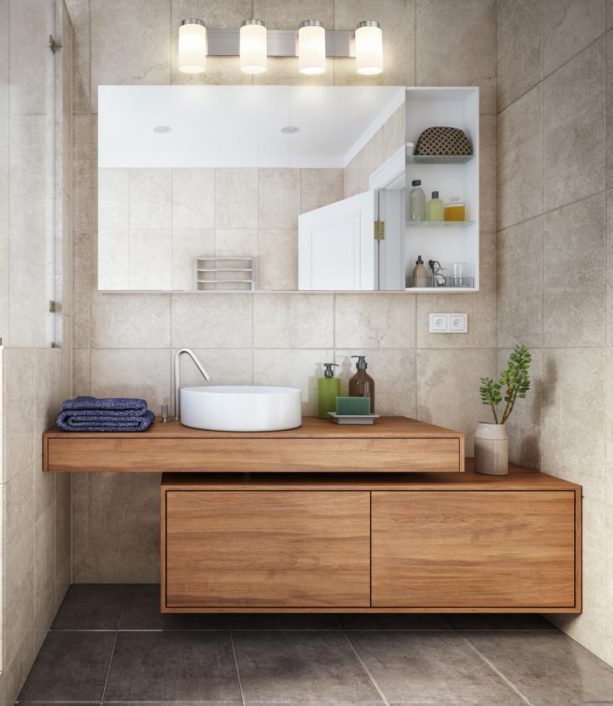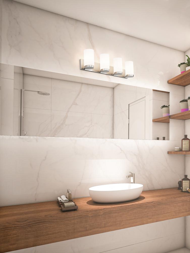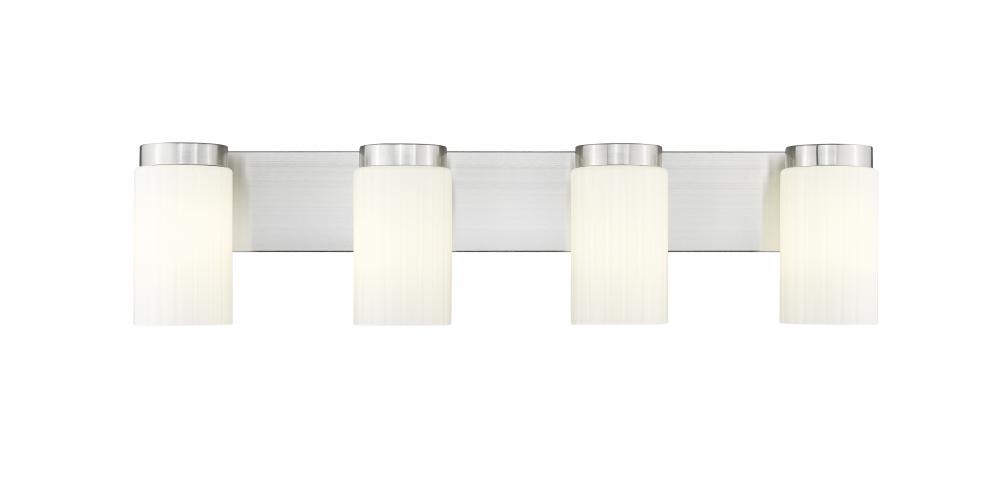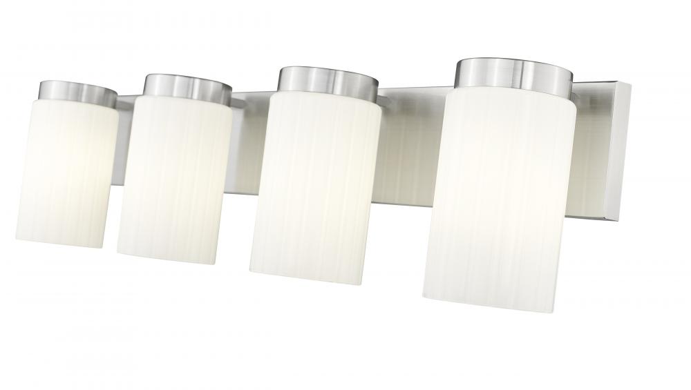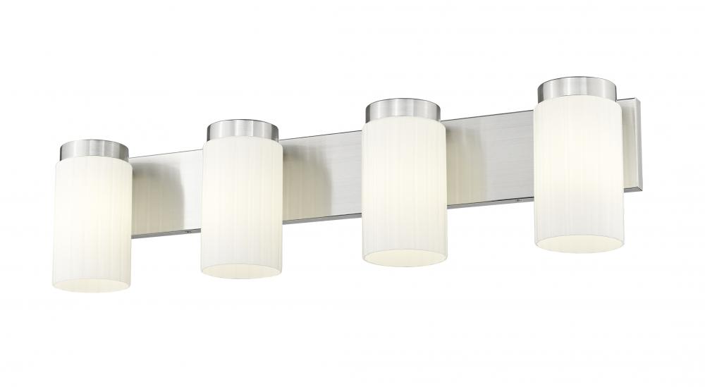 Simple elegance radiates from every aspect of a modern four-light vanity fixture from the impressive Burk collection. Its refined design pairs a brushed nickel finish rectangular wall plate and wide band with clear opal glass cylinders, gently diffusing illumination to create a fresh, sophisticated look over a vanity counter.