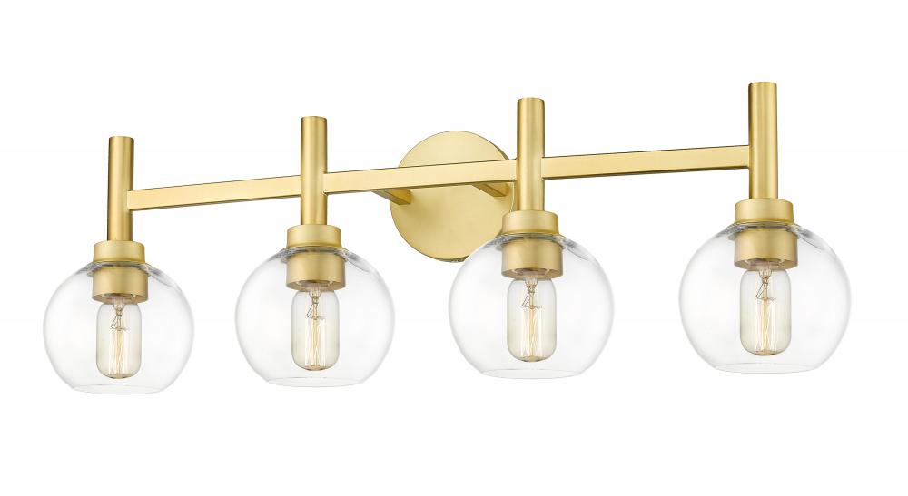 A precise, perfect circle creates the inspirations for the modern ambiance of third contemporary four-light vanity wall light. Designed for the Sutton collection, the sconce showcases four of torch-style lights paired with steel framing and a round wall plate, all in a warm brushed gold finish. A quartet of open-edged globe shades are expertly crafted in thick, clear glass, delivering maximum illumination to your vanity and bathroom space.