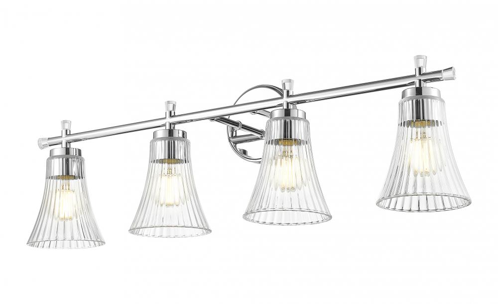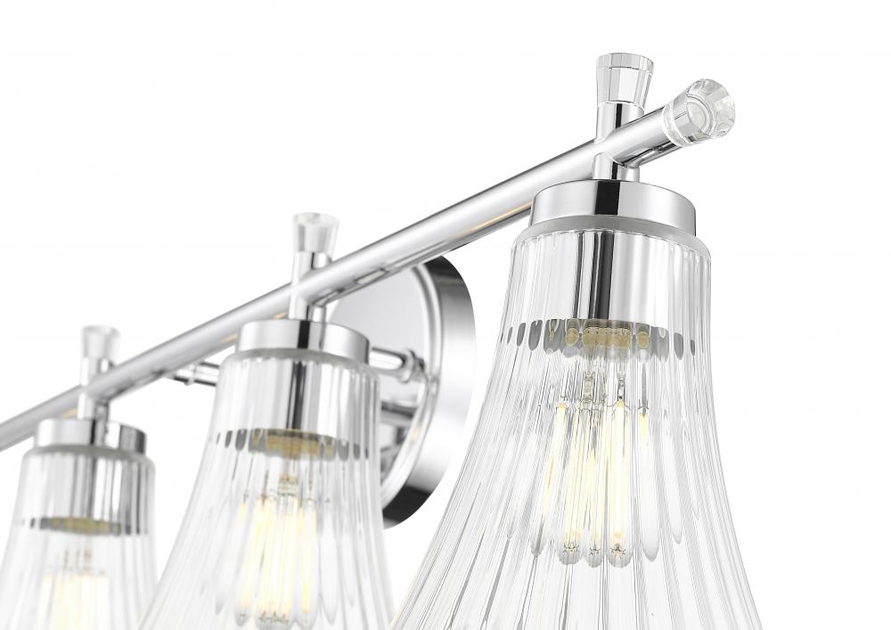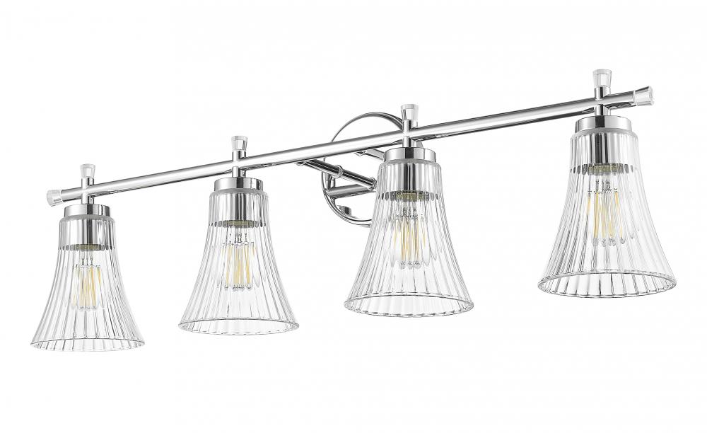With a chrome finish that gleams like fine silver, this four-light vanity fixture brings clarity and confidence to your space. Each fluted clear glass shade refracts light like a delicate prism, adding both texture and luminosity. It?s the kind of glow that flatters everything, and everyone, it touches.