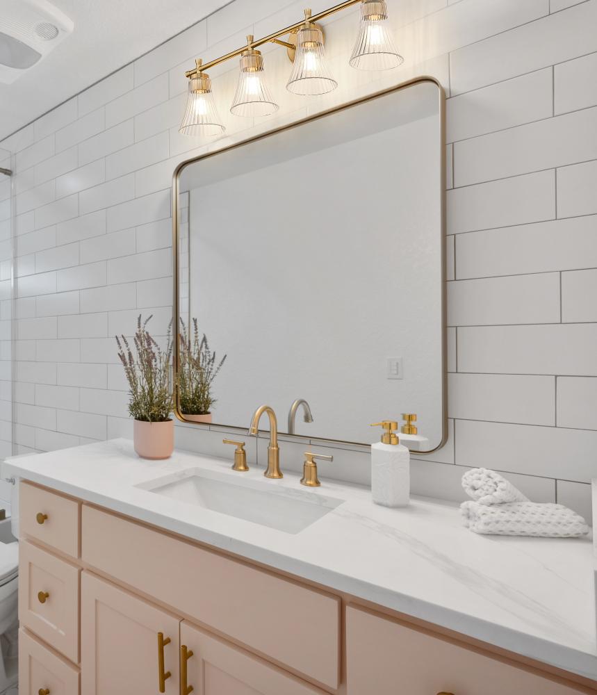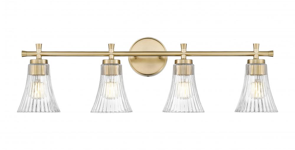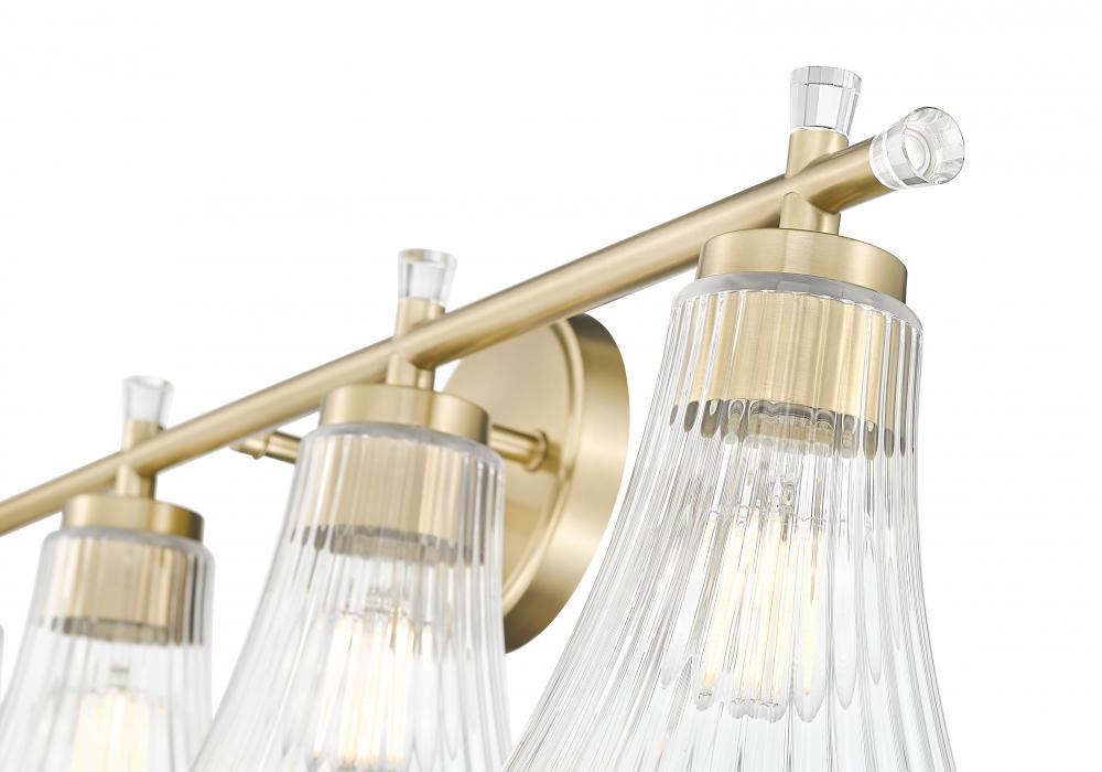 Glamor gets a graceful twist in this four-light vanity fixture with a modern gold finish. Fluted clear glass shades add delicate sparkle, reminiscent of vintage crystal details with a fresh, contemporary edge. It?s a radiant blend of warmth and elegance that softens every space it touches.