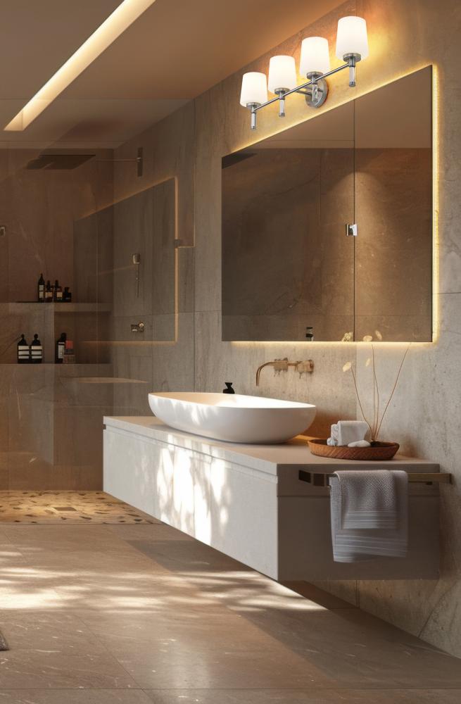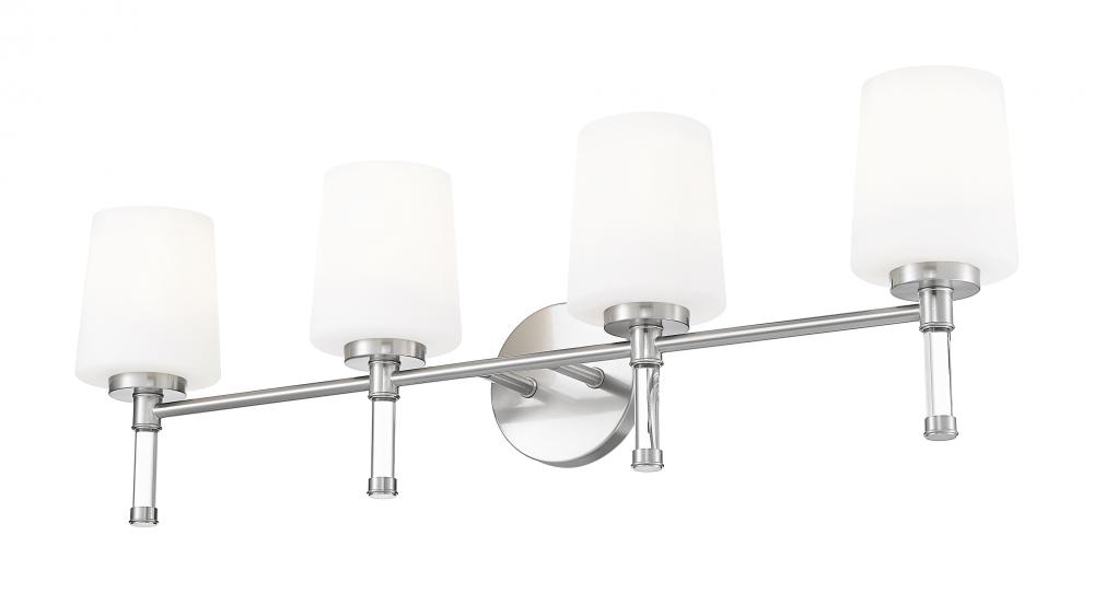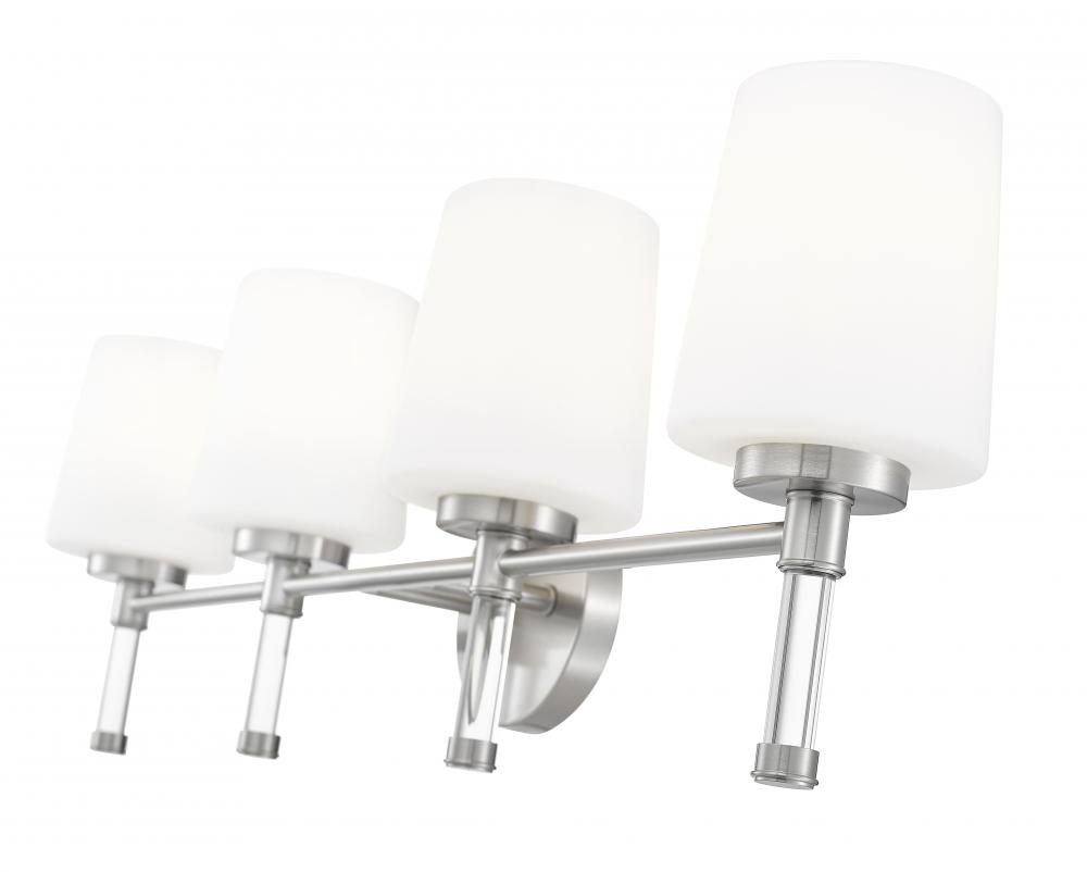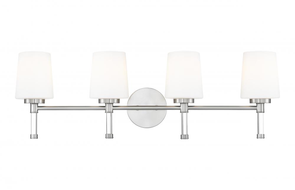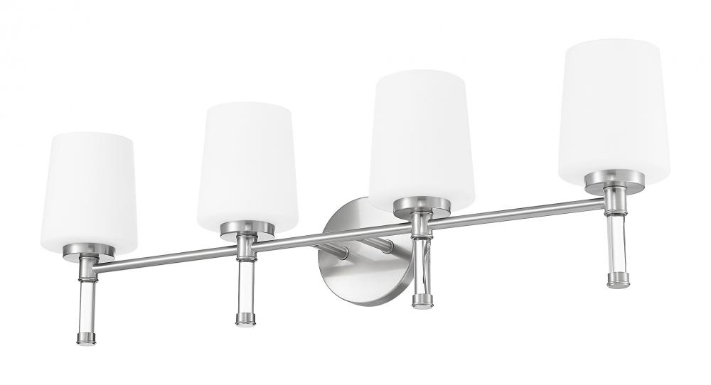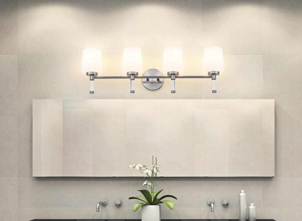Designed for wider counters and shared spaces, this brushed nickel four-light vanity light spans the wall with an easy, horizontal line that feels calm and organized. Four opal glass shades send out generous, even illumination that helps every corner of the mirror come alive, from the farthest edge of a double sink to the center where everyone gathers. In a busy household bath or a serene primary retreat, this dependable fixture acts as a steady anchor that keeps the room feeling bright and thoughtfully finished.