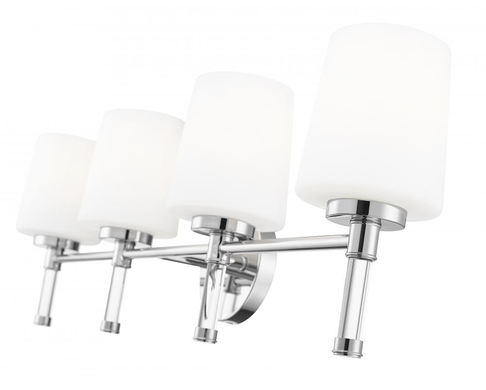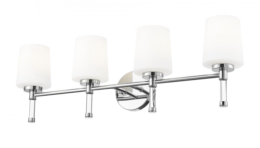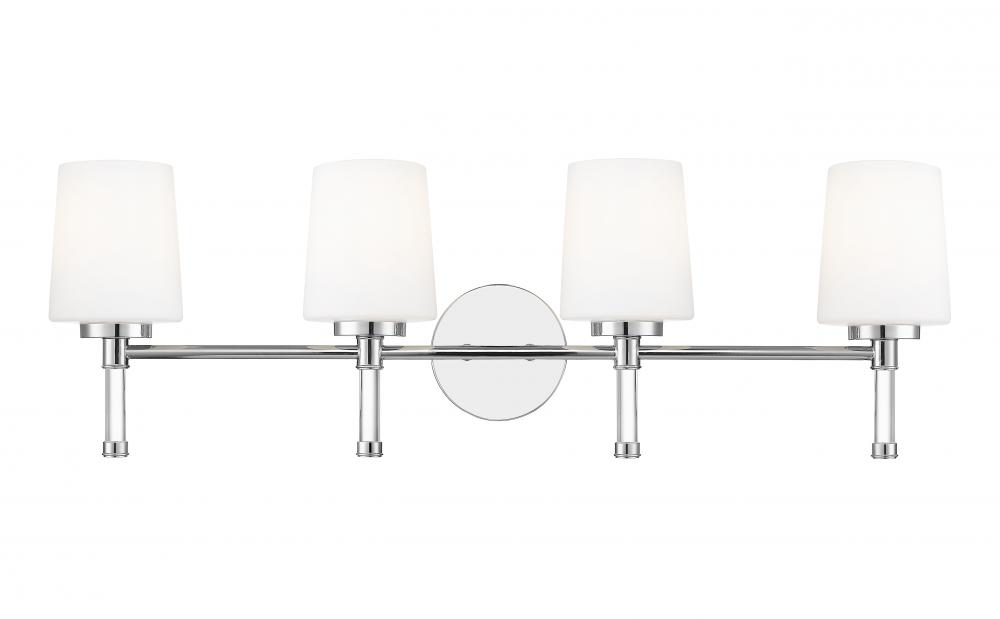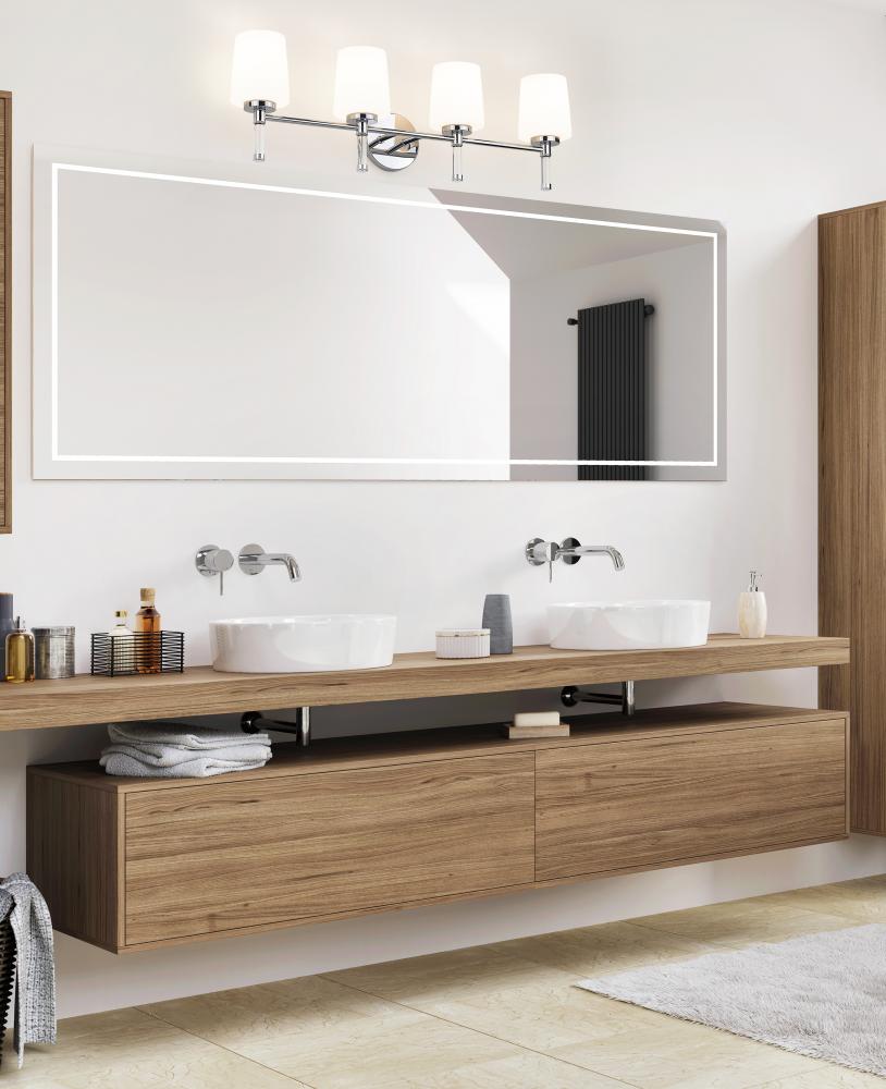 Full of sparkle, this chrome four-light vanity light brings a lively, reflective energy to larger bathrooms, echoing water, tile, and mirror with its gleaming surface. Mounted over a long vanity or recessed niche, this striking piece makes the entire wall feel purposeful and chic.