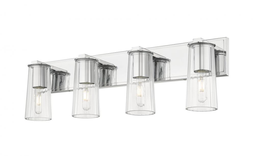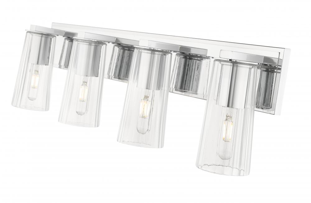 Gleaming chrome adds a refined, modern character to an industrial four-light vanity fixture. Perfect for bright illumination, it features tubular lights with vintage charm and clear tapered glass shades. A rectangular wall plate adds a clean-lined structure and timeless appeal.