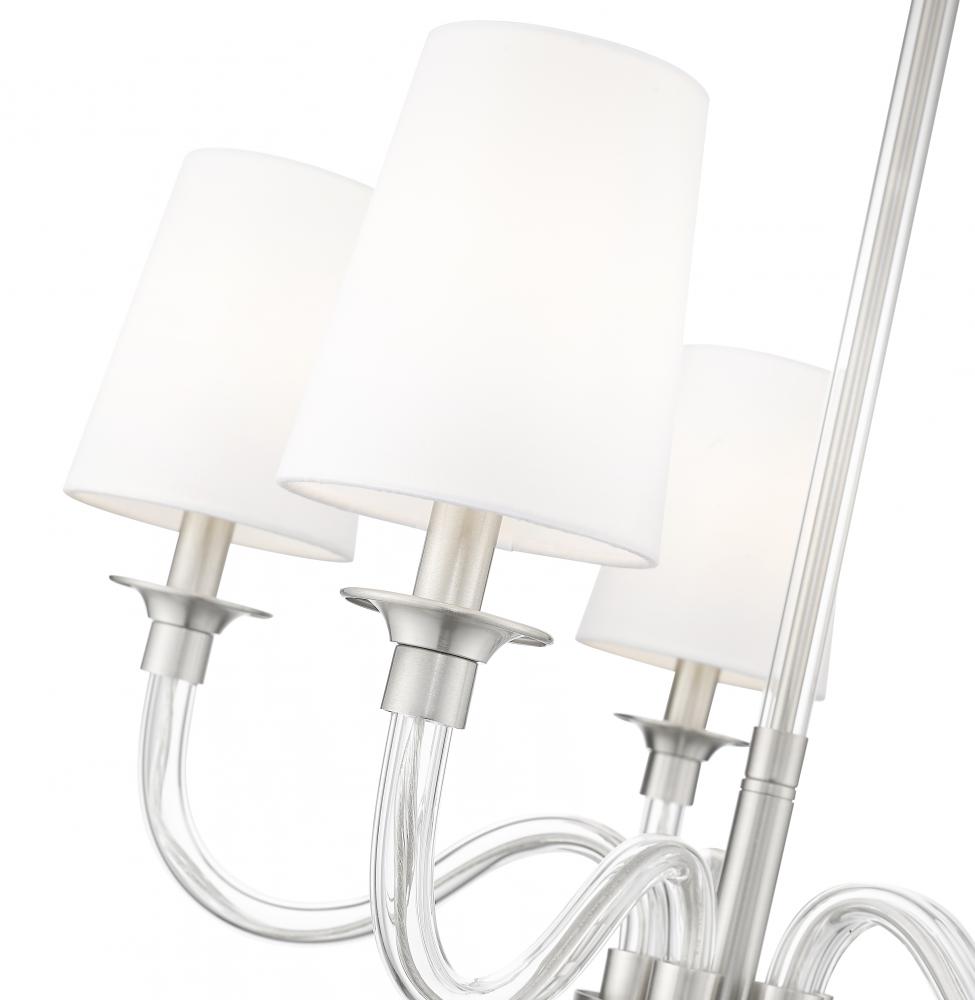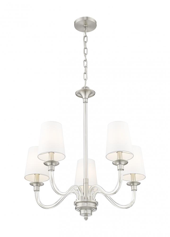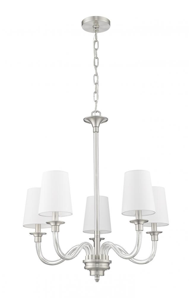 Capture the essence of classical pre-war elegance with this modern five-light chandelier. Its curvy arms are made from glass and pair perfectly with its brushed nickel finish frame, lending a sense of light, airy character. Each light is shaded with white fabric and a tapering silhouette, creating a refined finishing touch over your living or dining room.