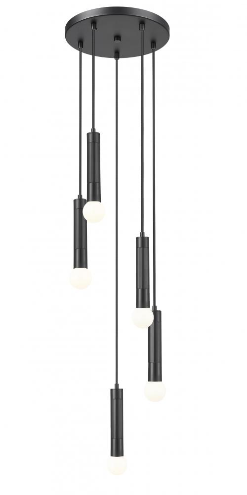 Crisp matte black and braided cords of varying lengths highlight this modern five-light round chandelier. It creates a tiered, spiraling effect, perfect for sculptural elegance over your entry, living area or bedroom. Elongated tubes ensure striking style, while its deep finish adds contrast and depth to surrounding decor.