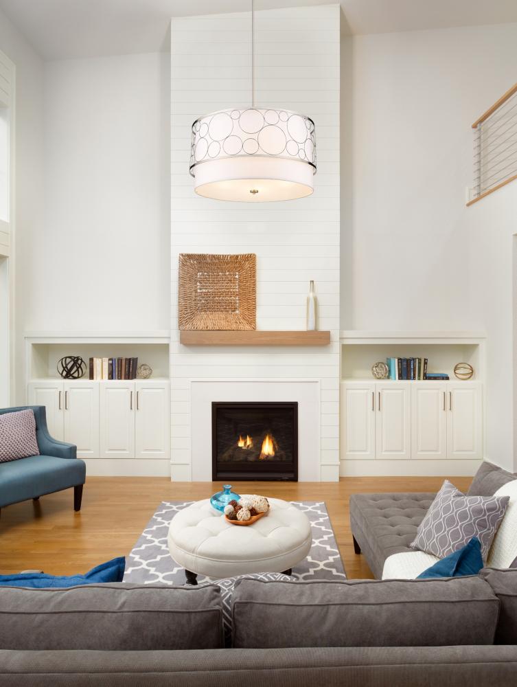 A sophisticated touch to spacious interiors like dining rooms and open concept living rooms, this modern five-light pendant boasts a tiered drum shape design that offers both style and grace. Open ringlets compress against one another to create an outer cage, elevated by a shiny brushed nickel finish. Behind it, a white fabric shade puts off a serene, captivating glow, casting a gorgeous silhouette across the space.