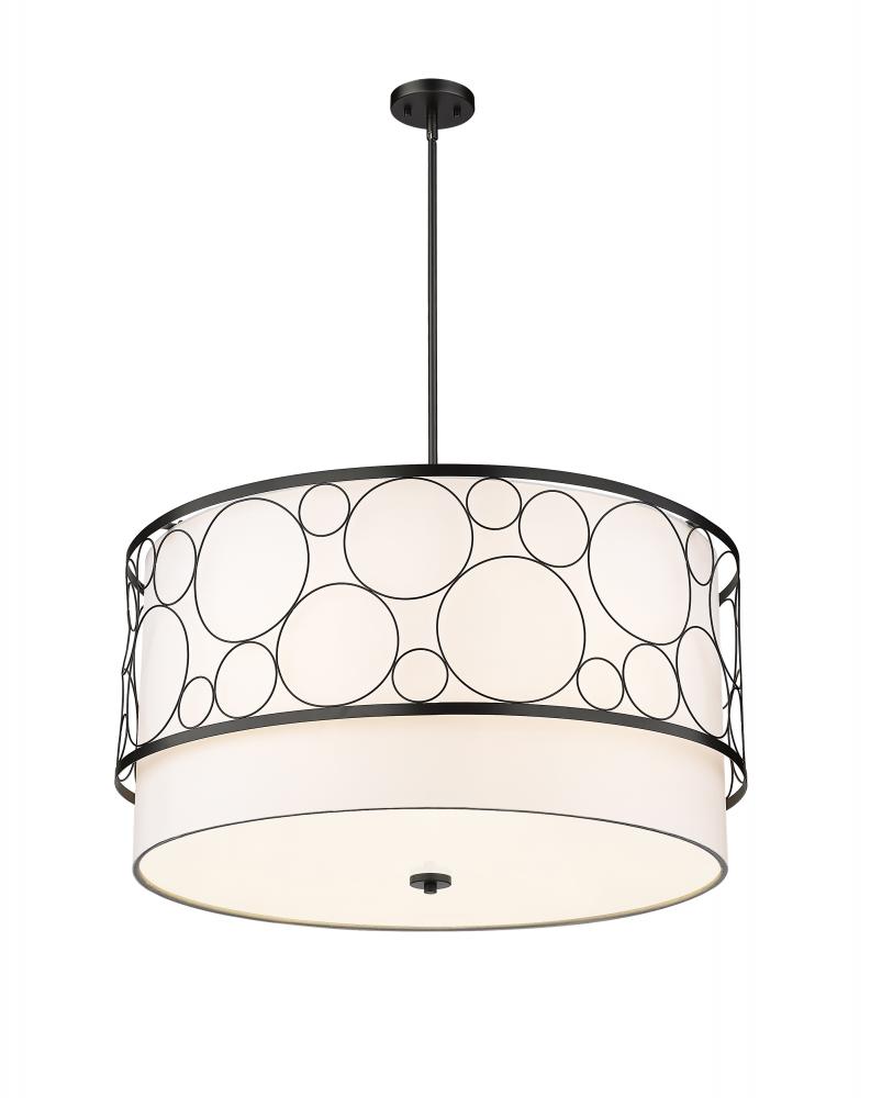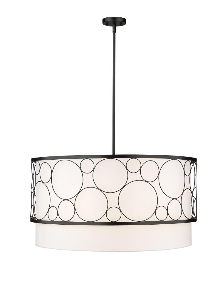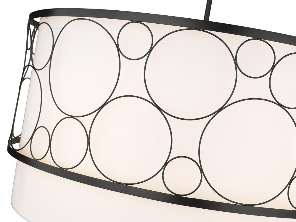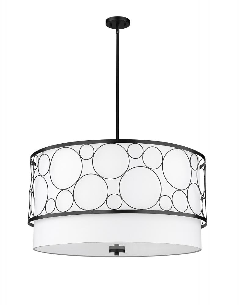 A sophisticated touch to spacious interiors like dining rooms and open concept living rooms, this modern five-light pendant boasts a tiered drum shape design that offers both style and grace. Open ringlets compress against one another to create an outer cage, elevated by a contrasting, stark matte black finish. Behind it, a white fabric shade puts off a serene, captivating glow, casting a gorgeous silhouette across the space.