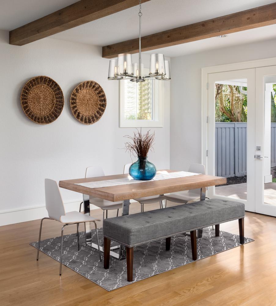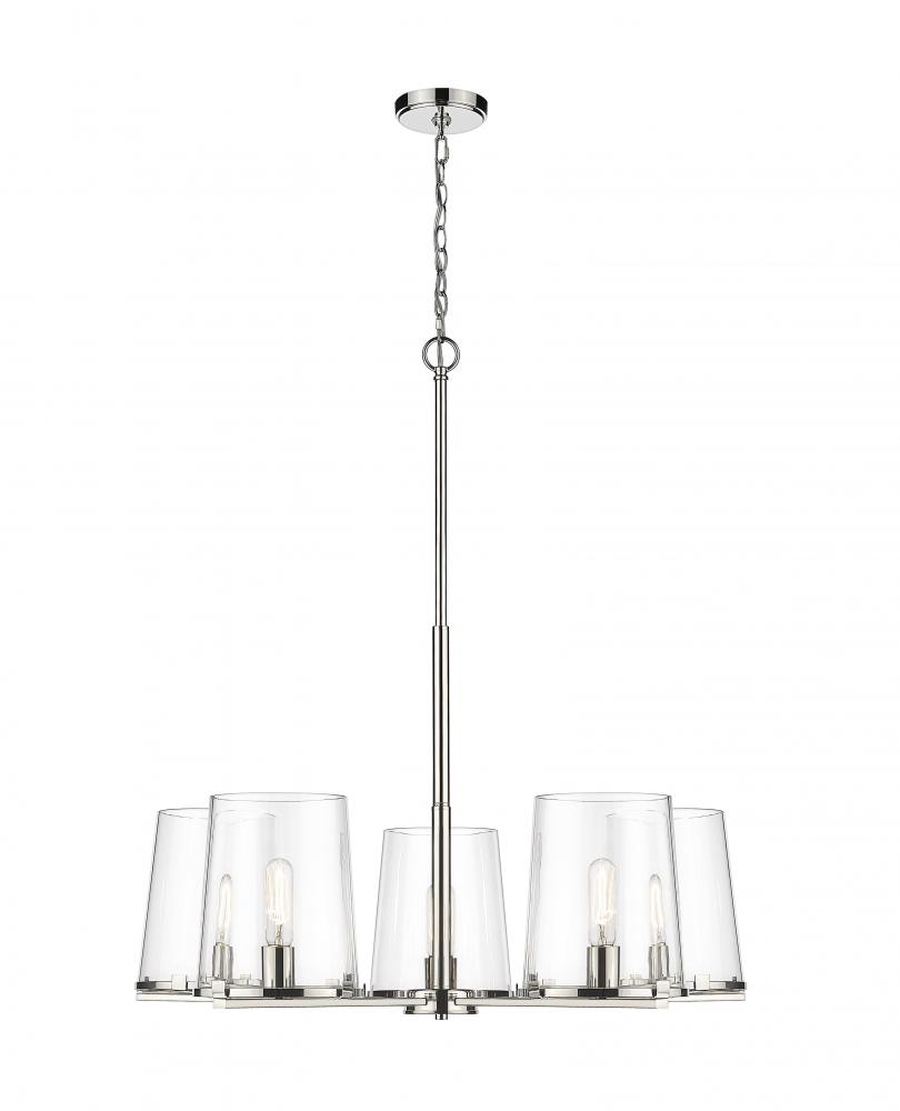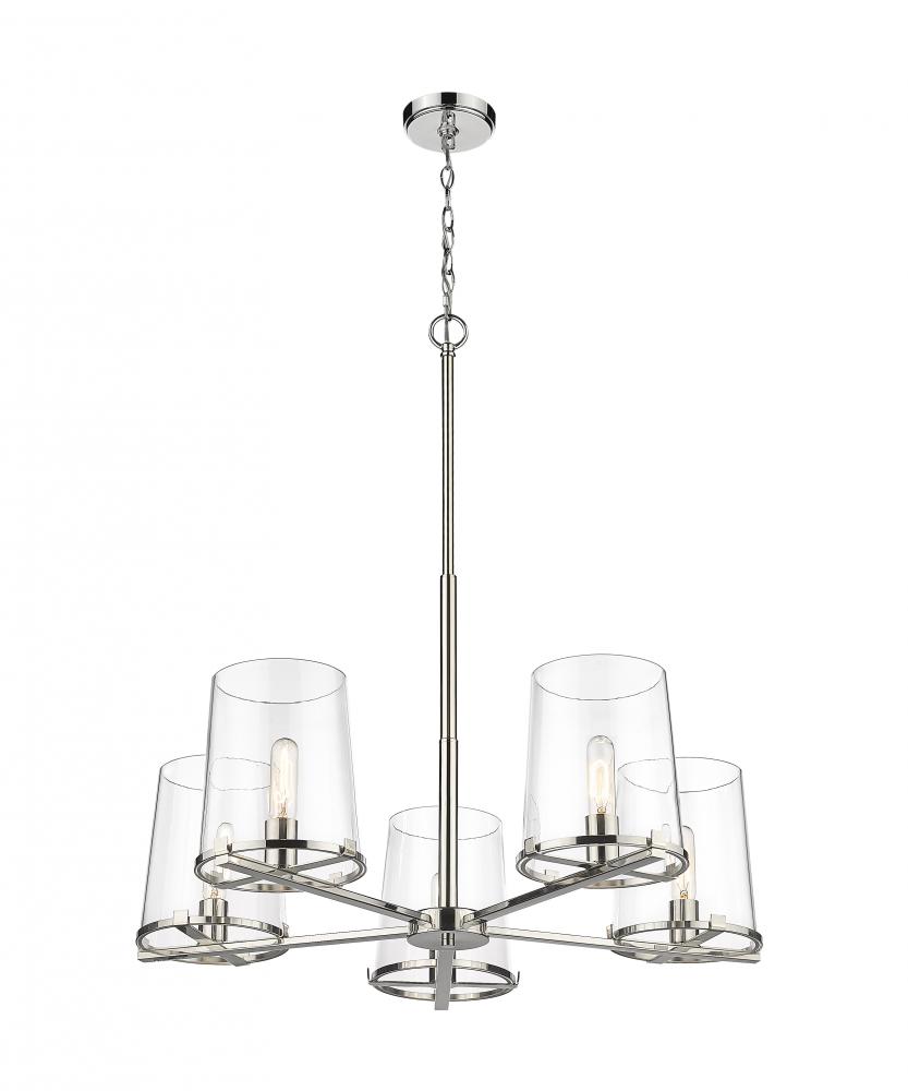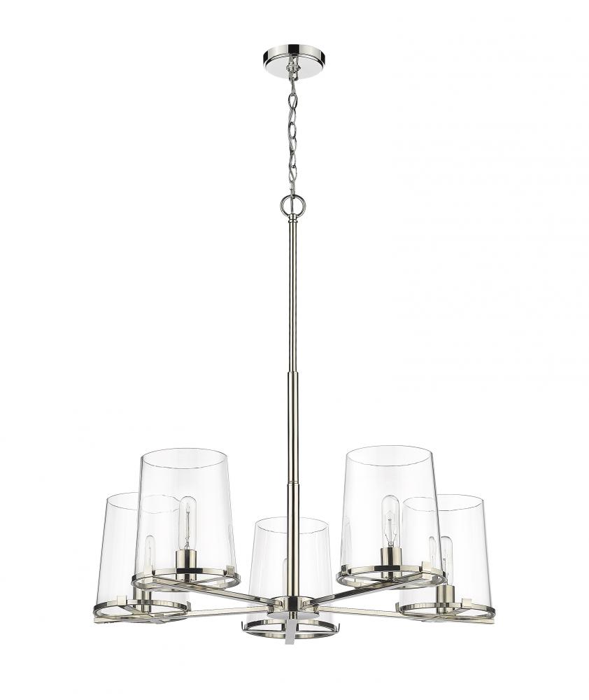 All eyes are on the chic glam style of the Callista five-light chandelier and its brilliant combination of nautical and village design themes. Decadence on display blends a hand-crafted polished nickel finish steel frame with ring holders that nestle sparkling tapered clear glass shades. Industrial-inspired accents adds versatility to this captivating fixture.