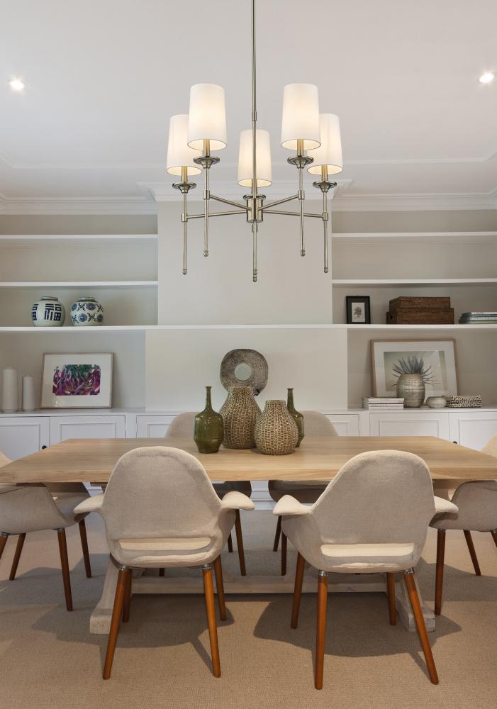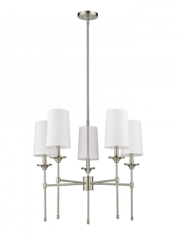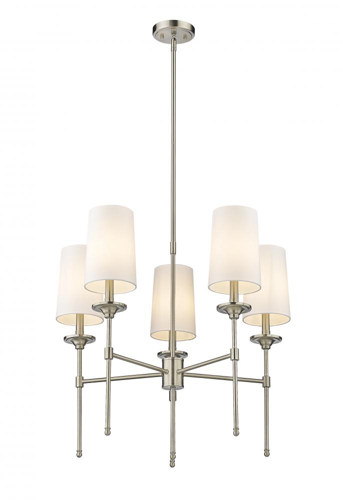 Emulating the most sophisticated design motifs, the Emily five-light chandelier adds a tasteful dose of decadence tempered by softness. This fixture features a carefully aligned collection of five lamp-like lights with off-white shades that encircle a frame fashioned of brushed nickel finish metal. A neutral palette creates welcomed versatility to blend with variable ensembles, and a classic aesthetic fit for an upscale living space.
