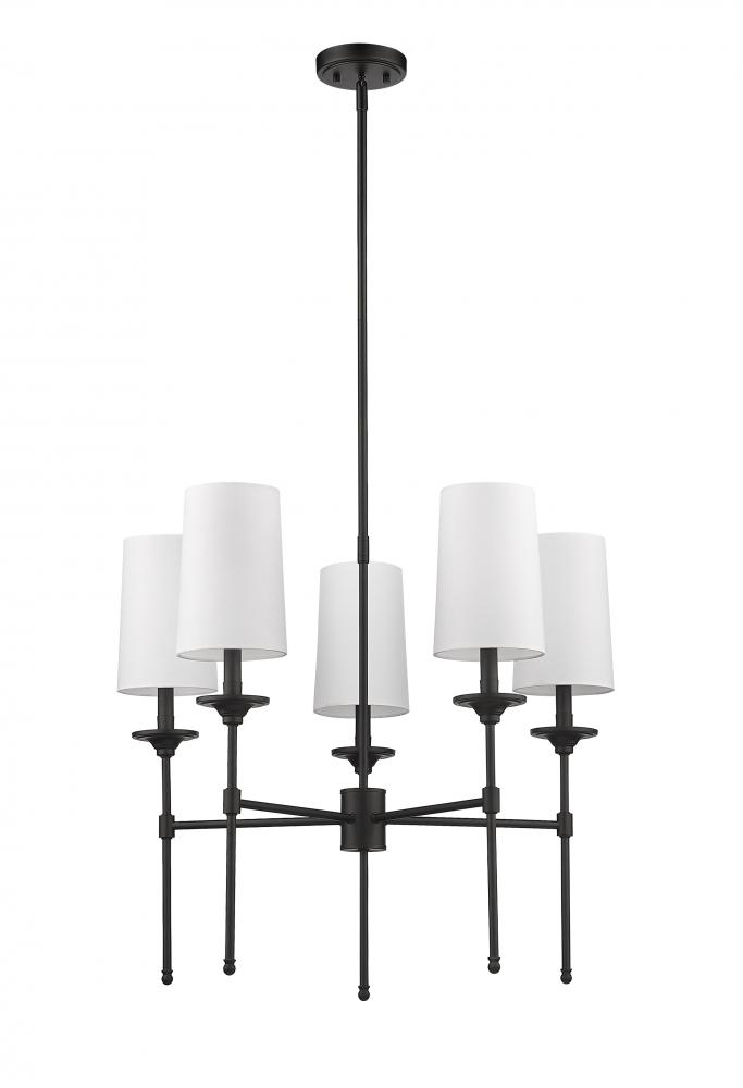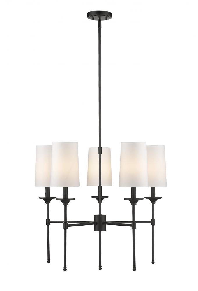 The Emily five-light chandelier adds a tasteful dose of decadence tempered by softness and transforms a dining space or living area with class. This fixture features a carefully aligned collection of five lamp-like lights with off-white shades that encircle a frame fashioned of matte black finish metal. A contrasting palette creates welcomed versatility to blend with variable ensembles, and a classic aesthetic fit for an upscale living space.