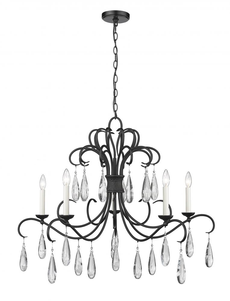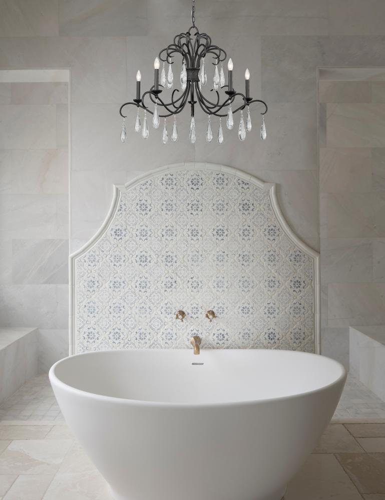 Sinuous scrolls and delicate crystal teardrops lend lush sophistication to a contemporary five-light chandelier. In matte black, it creates a rich, organic design element over an entry or in a dining room. Candelabra lights are a classic touch, offering a soft, warm glow for inviting ambiance.