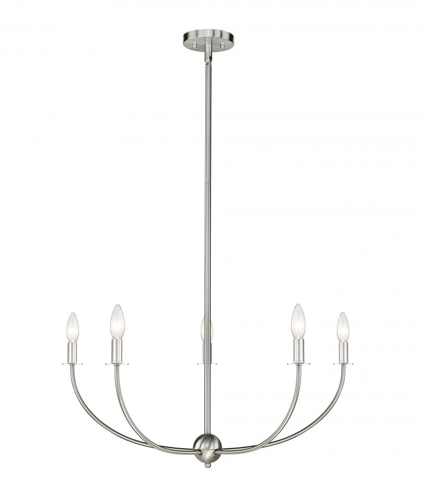 Reflect on a tasteful contemporary flavor in lighting for a modern or transitional space as the Shannon five-light chandelier delivers ambient lighting and a symmetrical silhouette. Embrace the graceful aesthetic of a brushed nickel finish steel frame with subtly curved arms culminating with lights capped with classic white fabric shades. This minimalist chandelier tells a story of measured elegance suited to a dining space, kitchen, or entryway.