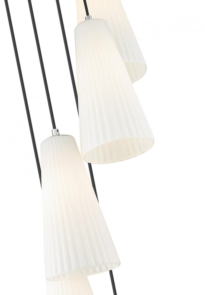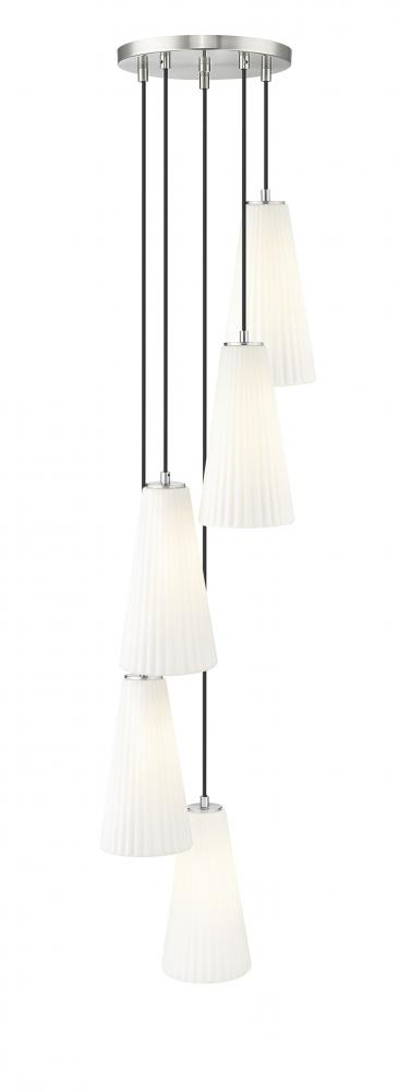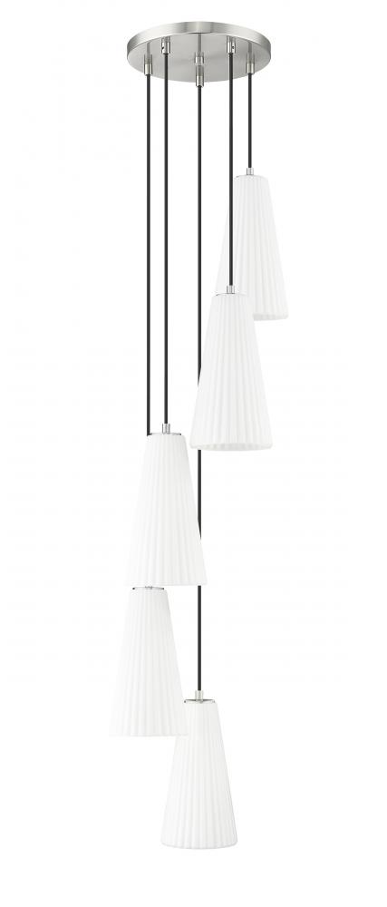 Varied suspension heights create the chic, spiraling silhouette of a modern five-light chandelier. A striking choice over a staircase or dramatic foyer, it shows off delicately fluted white glass shades paired with a brushed nickel finish canopy and black suspension cables, creating a stylish sense of contrast and depth.