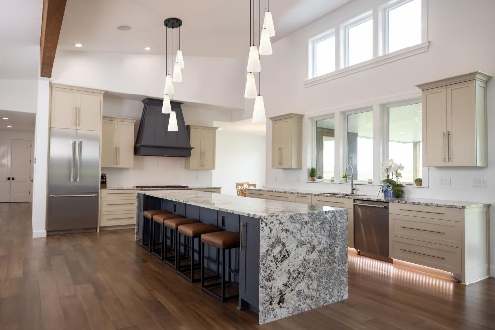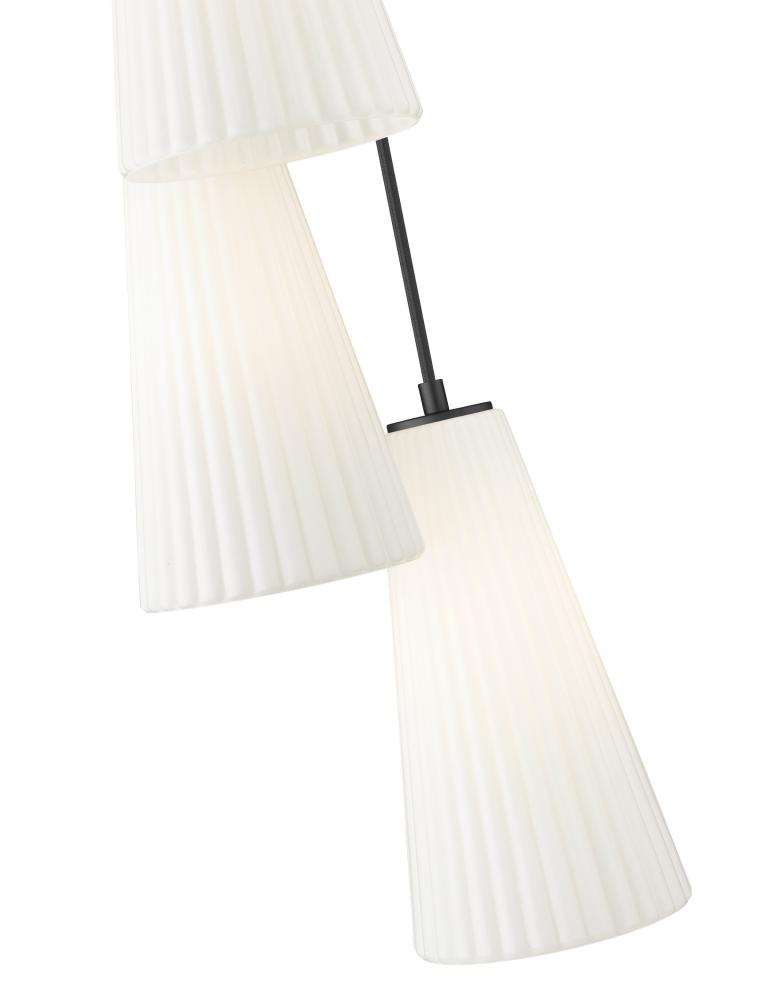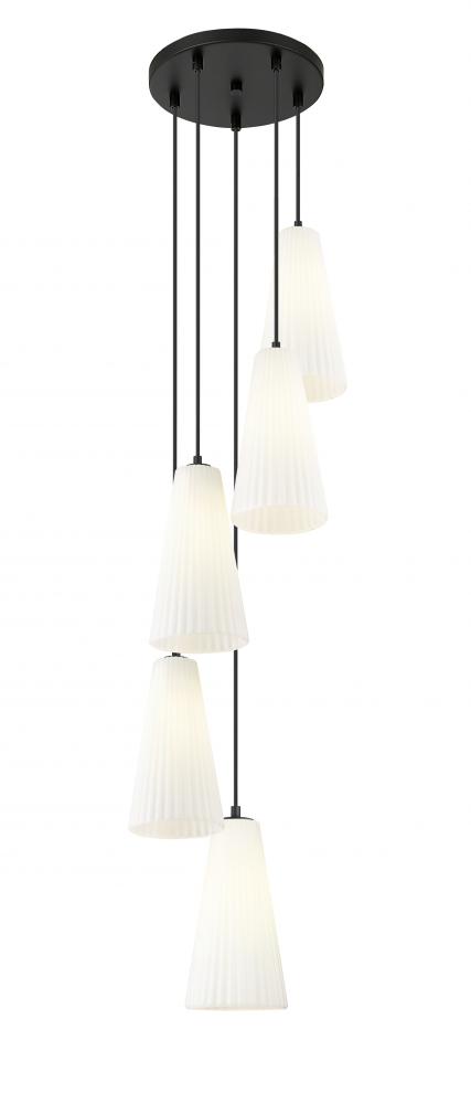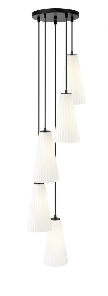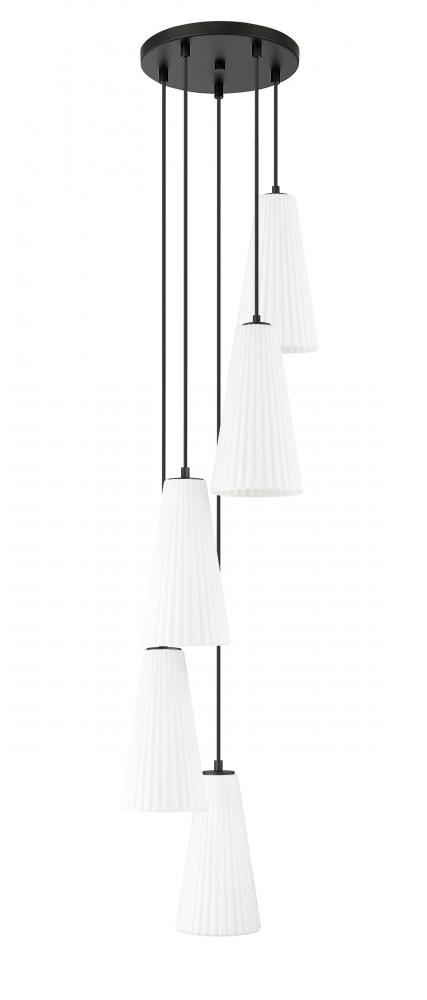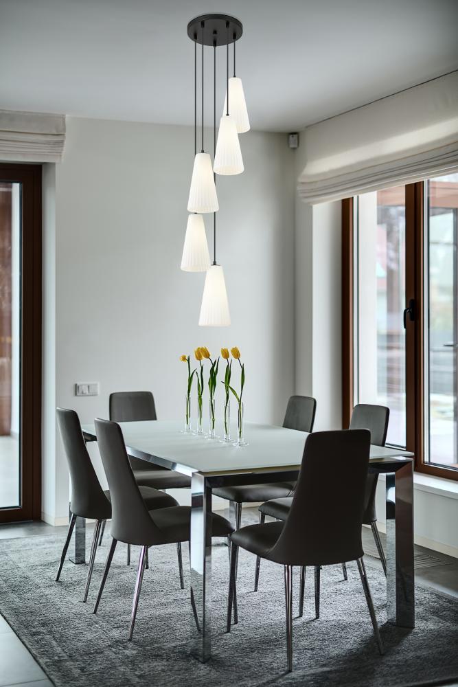 Embrace the spiral design of a modern five-light chandelier. A matte black finish canopy creates depth and contrast, while elongated conical shades in frosted glass encircle the fixture to provide soft, diffused illumination over a staircase or foyer.