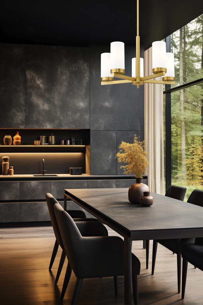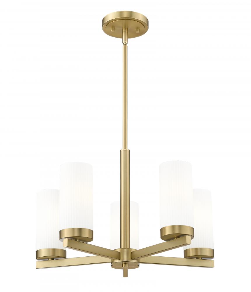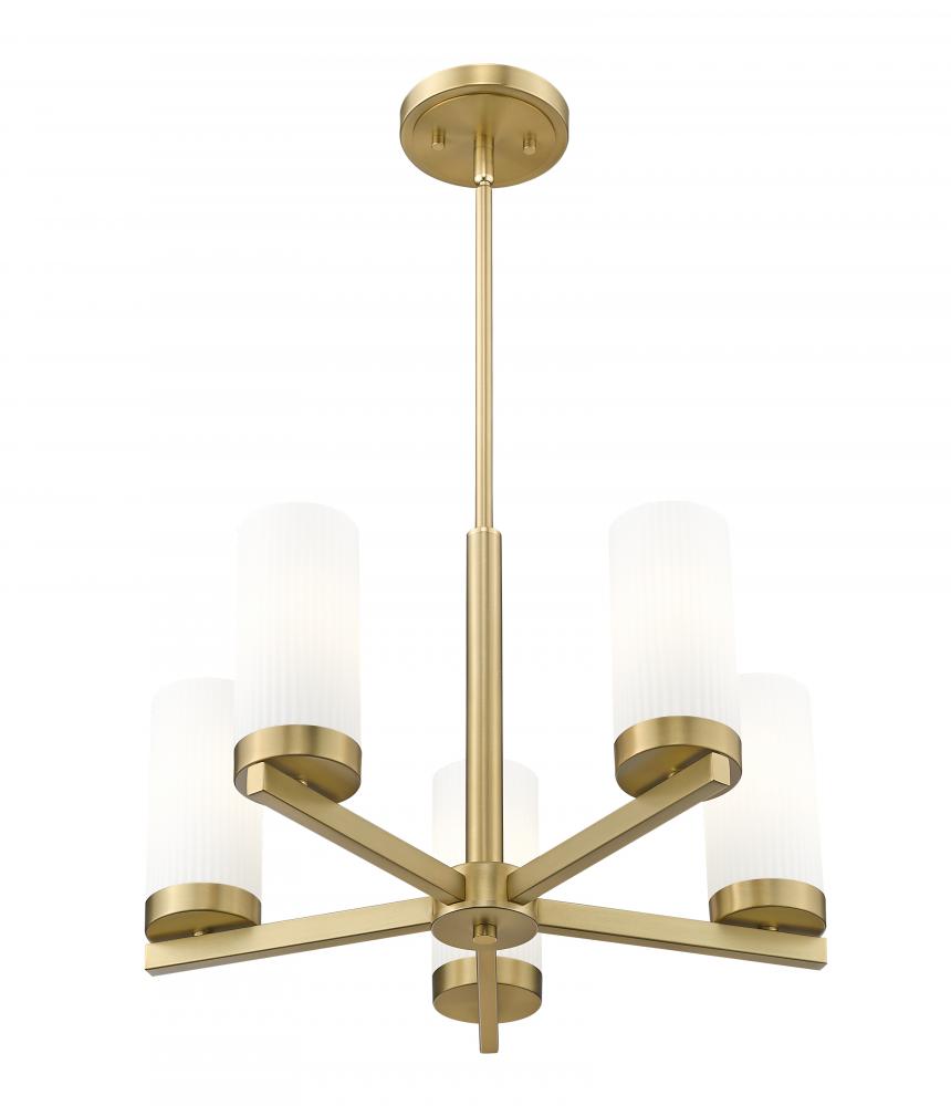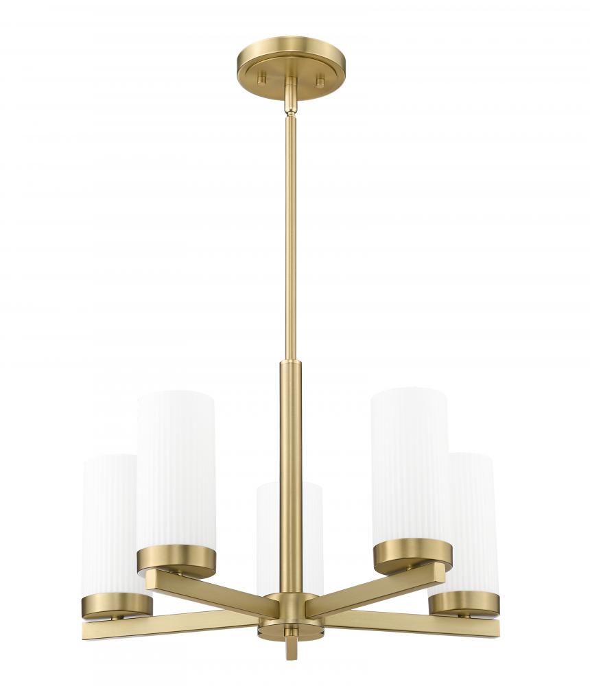 A luxe look and feel infuses a modern gold finish to create chic flair for a contemporary five-light chandelier. Around silhouette and radial arms cast beautiful illumination, while five cylindrical shades of frosted glass ensure a soft, inviting ambiance perfect for your living or dining room.