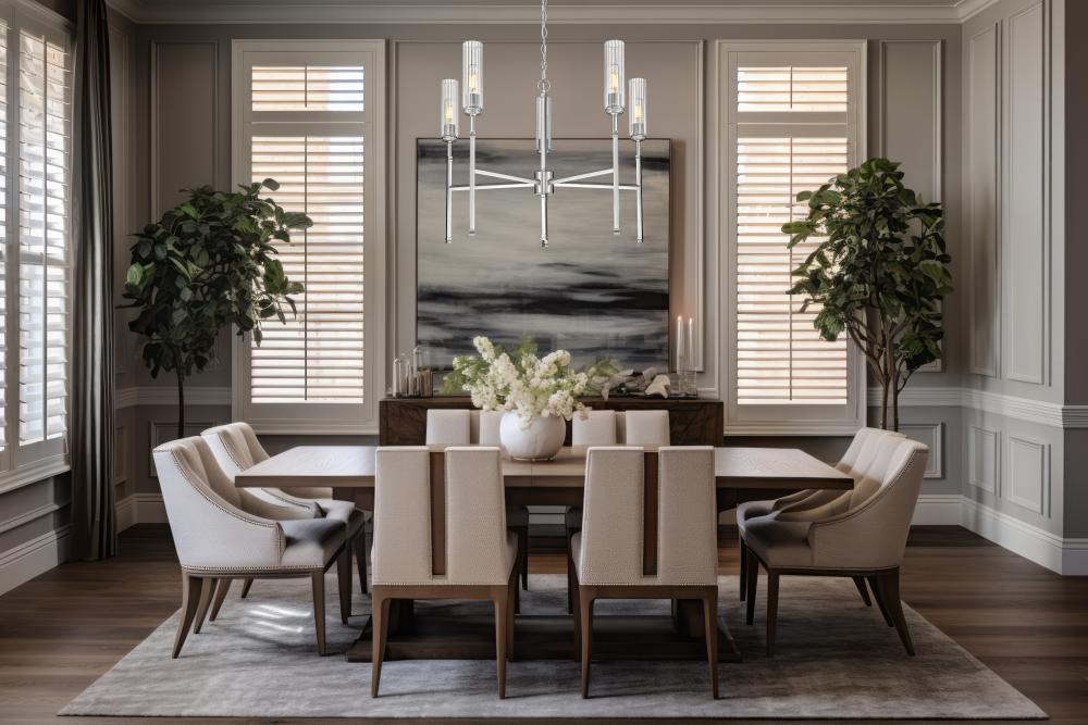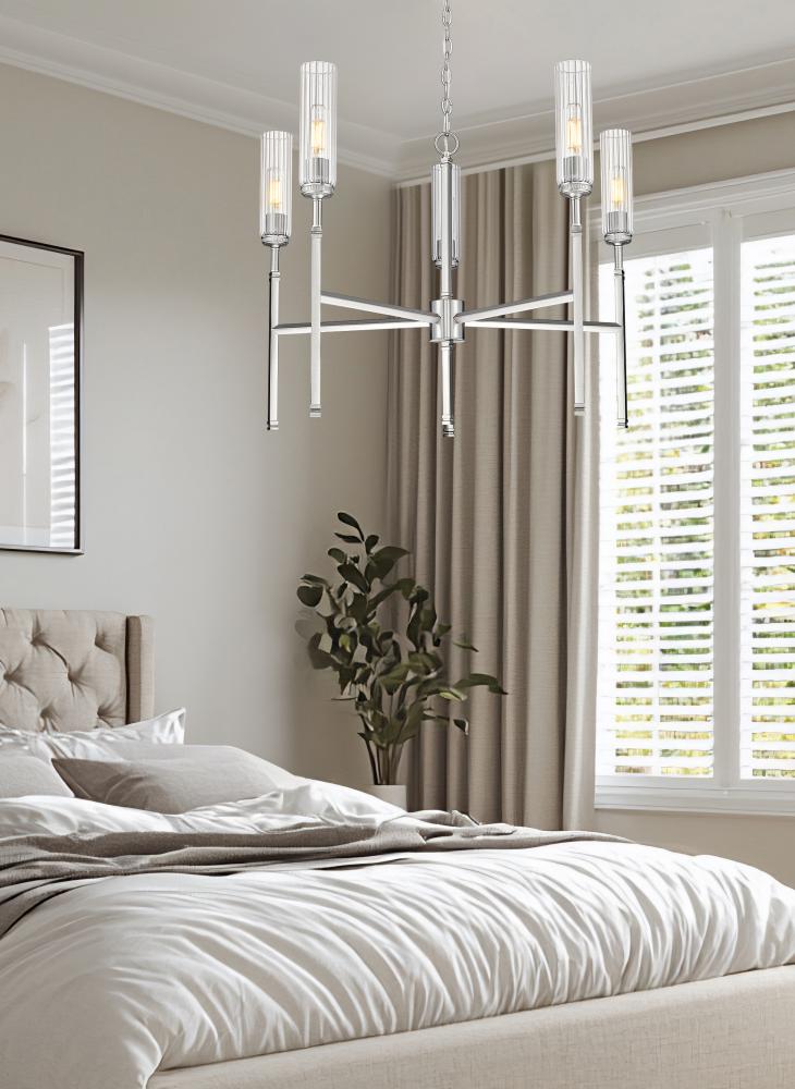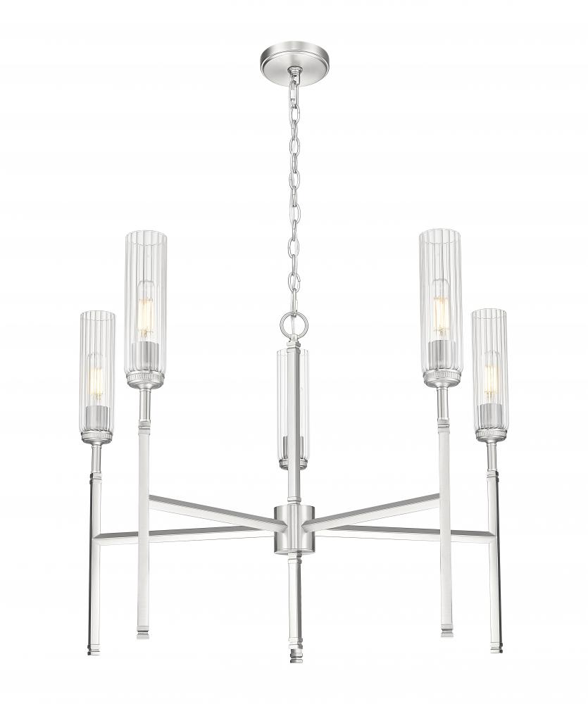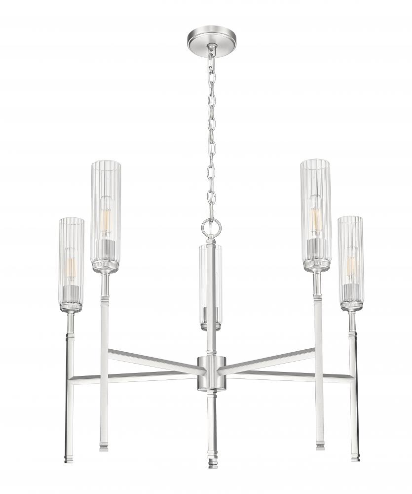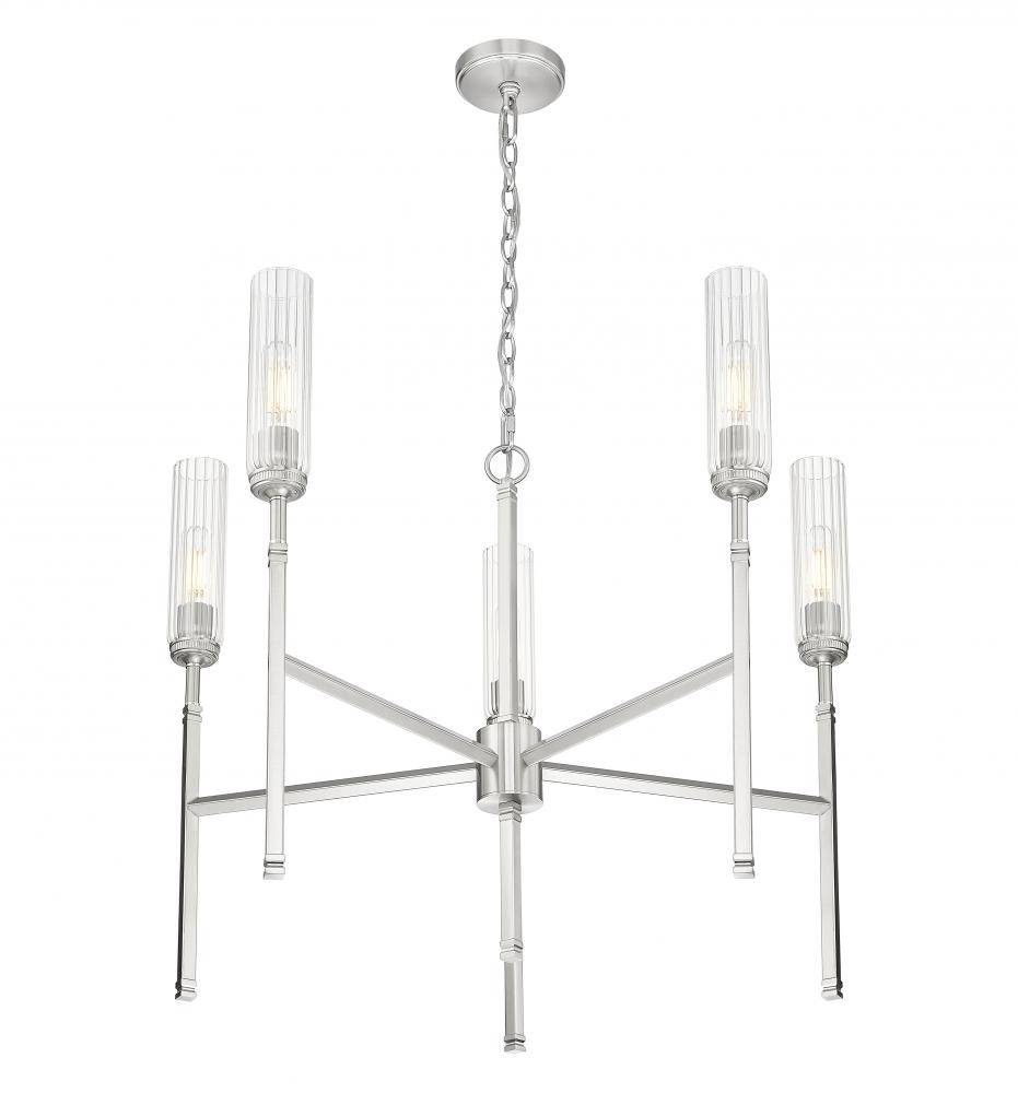 Slim, staggered shades keep the silhouette compact while offering radiant sophistication in this modern five-light chandelier. In a brushed nickel finish, its a sleek choice, perfect over a dining table or elegant entry. Slender stems and fluted clear glass shades evoke champagne flutes, adding texture and depth to surrounding decor.