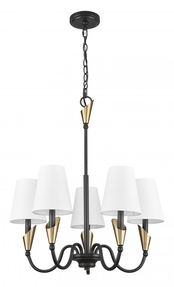 A sophisticated twist on a classic form, this two-tone chandelier brings dimensional beauty to your space. Matte black arms sweep upward with grace, accented by modern gold and softened with glowing linen shades. It?s a refined touch that captures both contrast and cohesion.