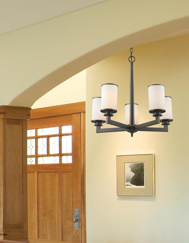 The contemporary Savannah family adds sophistication to home d?cor. The beautifully appointed olde bronze fixture is perfectly paired with matte opal glass shades in this 5 light chandelier.