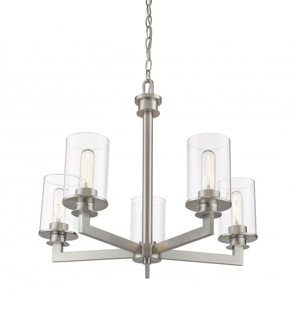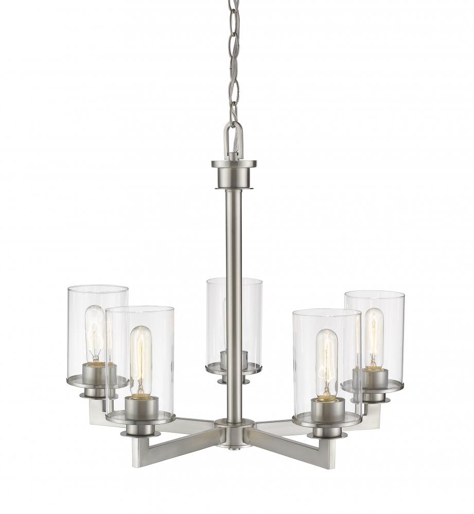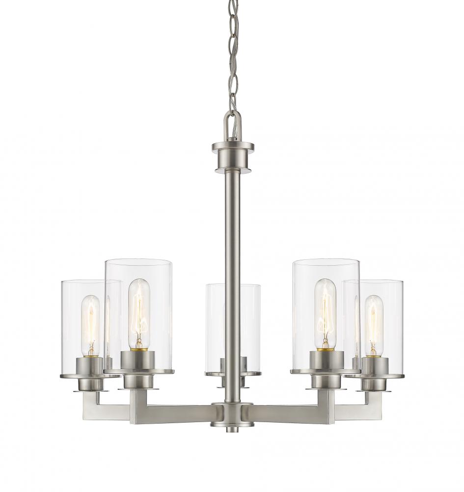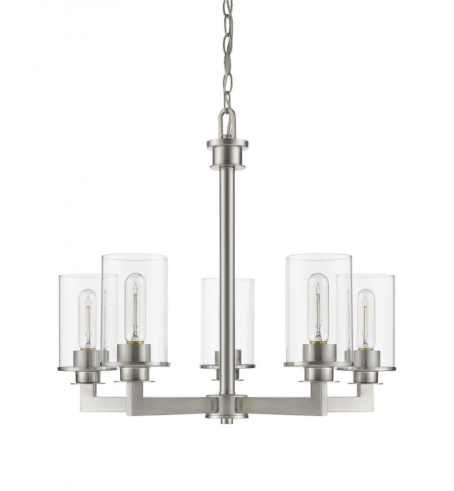 Visions of modern art give this mid-century modern five-light chandelier elegant sophistication. A brushed nickel finish highlights the gleaming brilliance of the clear glass cylinder-shaped shades.