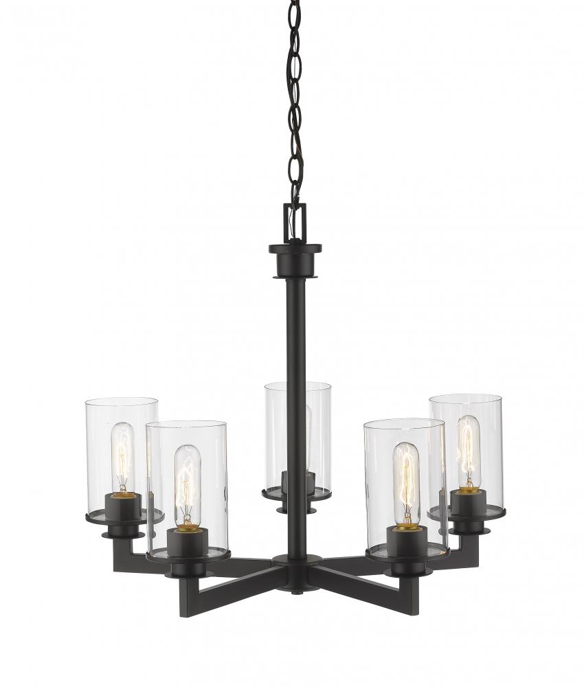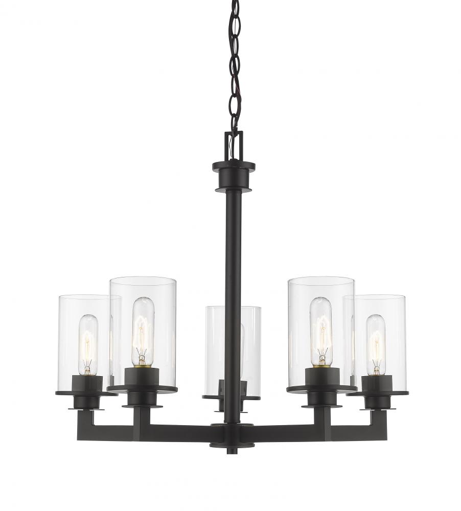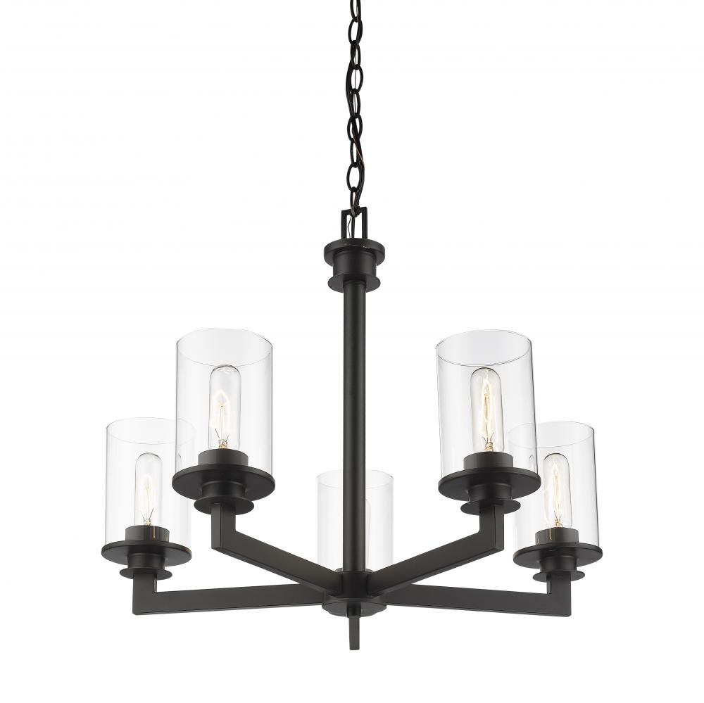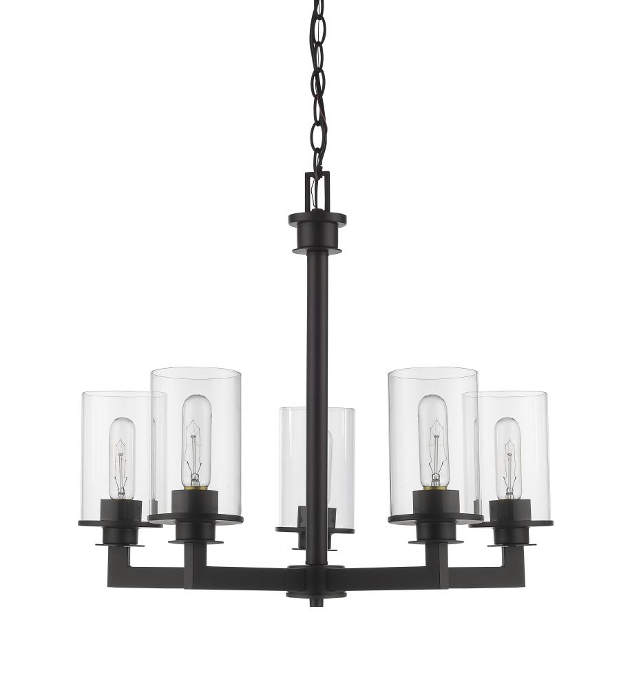 A touch of old world style gives this mid-century modern five-light chandelier elegant charm. A bronze finish emphasizes the glowing brilliance of the clear glass cylinder-shaped shades.
