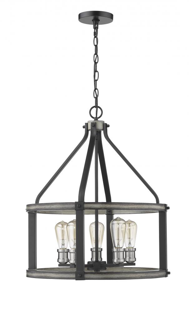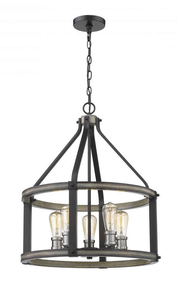 The open frame from this five-light pendant light gleams with the radiance of exposed lightbulbs. Complete a modern industrial theme with the ashen faux barnboard design, full of sleek lines and subtle curves.