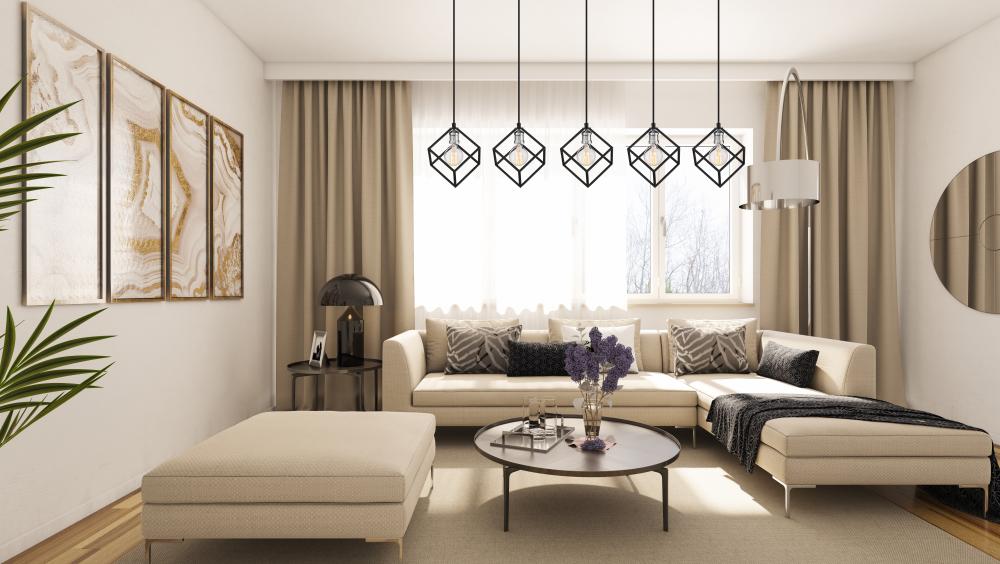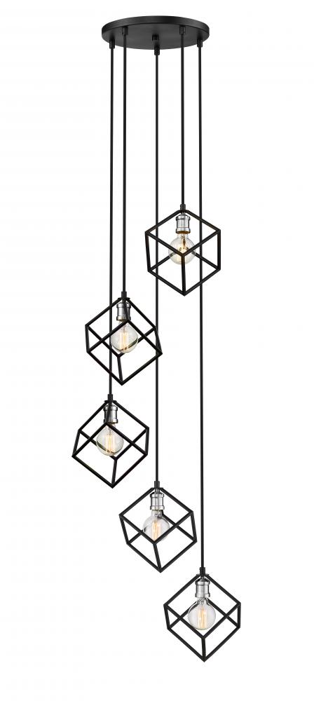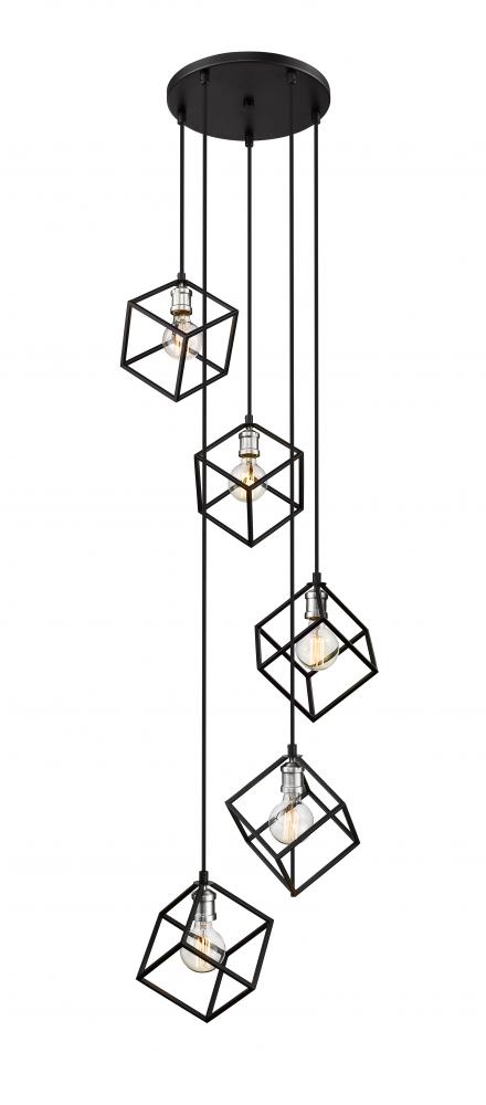 A sense of movement and energy are conveyed in the design of this two-tone five-light pendant for your home. Its fashioned with a matte black and brushed nickel finish with cube-shaped shades hanging at different heights for an electric look and feel that youll love. Itll add a vibrant dynamic to any dining room, foyer, living room, or entertainment room.