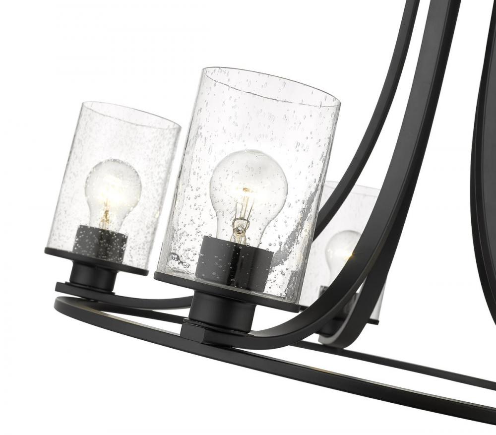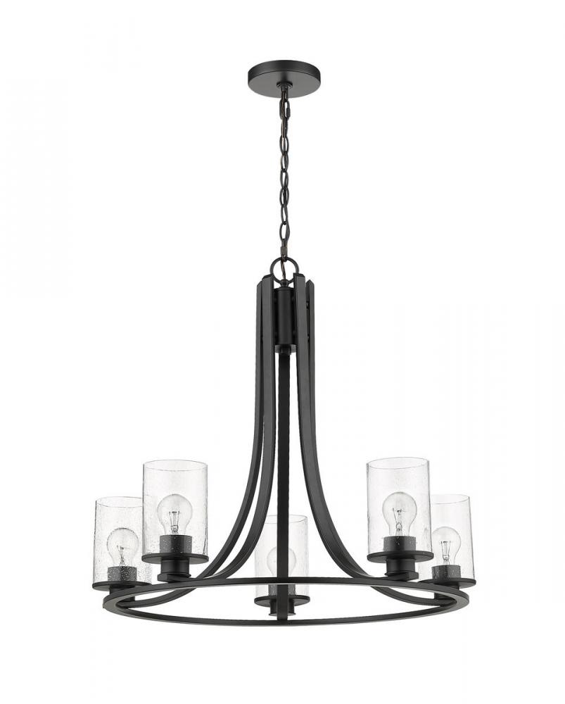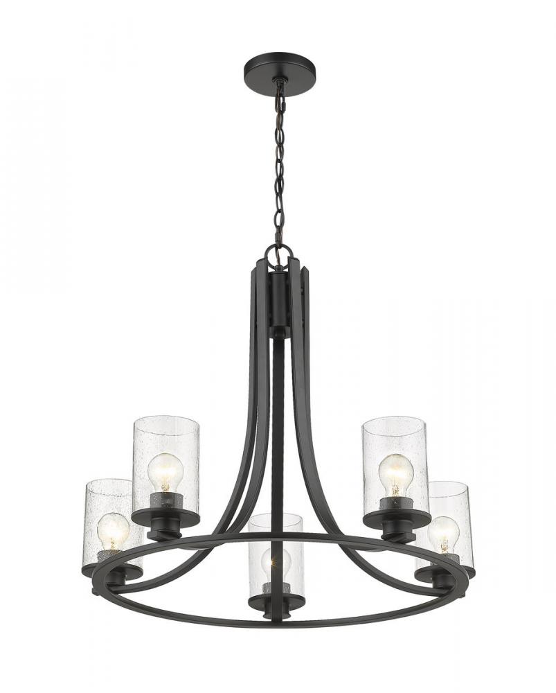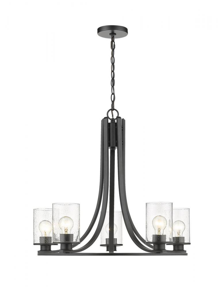 Design simplicity adds class and taste to a modern space with the addition of this five-light chandelier from the Beckett collection. A round frame crafted of matte black finish steel delivers a delightful silhouette with long, flared arms. Clear seedy glass shades in a cylindrical shape complement its artful form and introduce a hint of romance, making this chandelier an excellent selection for contemporary to transitional dining rooms, hallways, and main living areas.