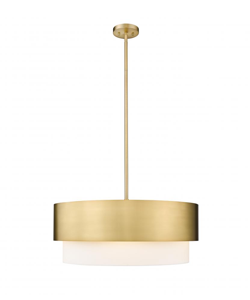 Elegant simplicity reflects a clean look in a light fixture with both Mid-Century Modern and industrial influence. This five-light pendant from the Counterpoint collection creates a lush look with a modern gold finish steel frame and protruding white fabric shade. A round silhouette infuses character to a light fixture delivering ambient illumination in a dining space, main living area, or foyer.