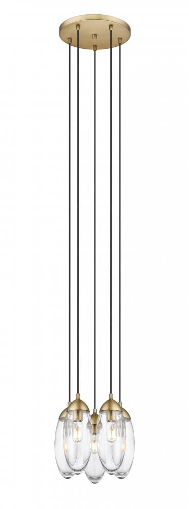 Bring ambient lighting and a glam artistic vibe to a nook or entryway with a fixture created to impress. This five-light chandelier delivers organic sensibility with a gallery influence, dangling delicate oval glass shades from a round metal canopy with a rich rubbed brass finish. Transform a compact setting into a display venue for elegance in lighting and design.