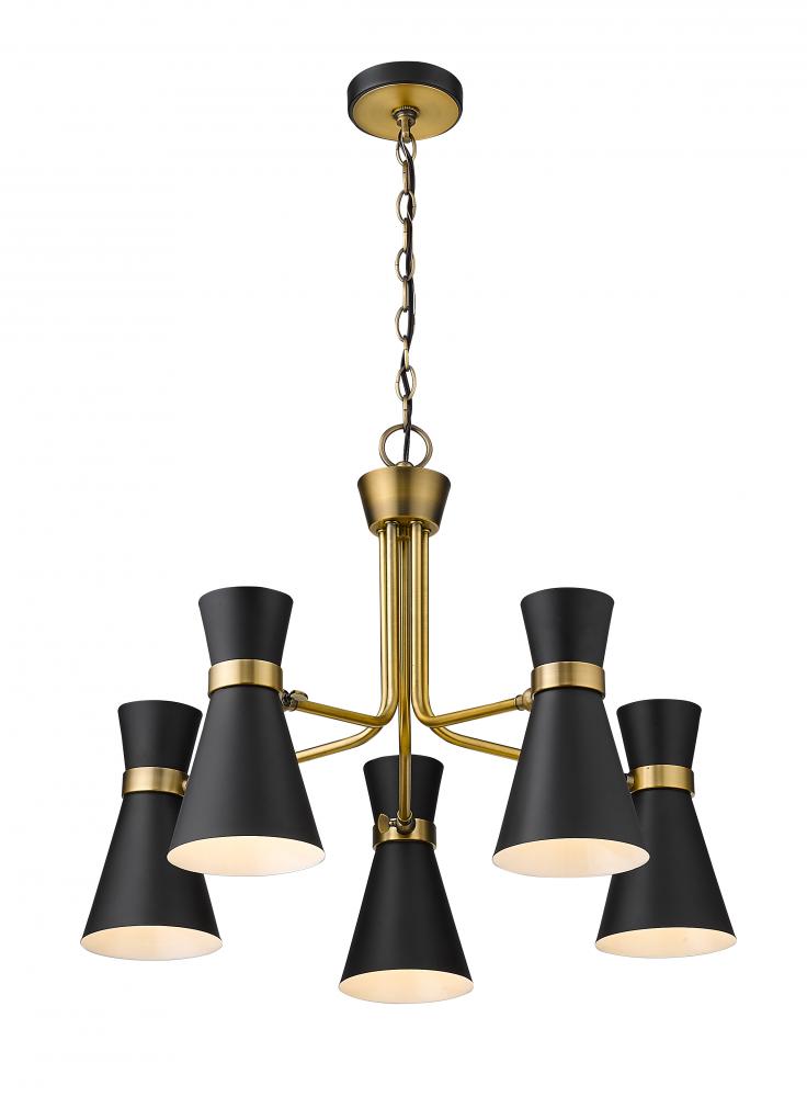 A decorative quintuplet silhouette shapes industrial influence that adds casual elegance to this matte black finish steel five-light chandelier. Dress up a dining or entertaining space with this tasteful fixture trimmed with heritage brass finish steel. This sleek chandelier captures the heart of romantic industrial charm.