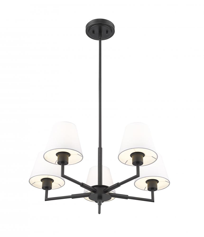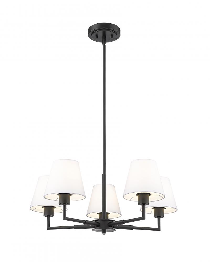 Chic white linen empire shades play into the design flexibility of a modern five-light chandelier. Expertly designed with simplicity at the forefront, the chandelier pairs a cool matte black finish frame with straight suspension and complementary angularity, all capped with conical shades that create the perfect hint of dimensionality for a fixture that looks great everywhere from the dining room to a bedroom dressing area.