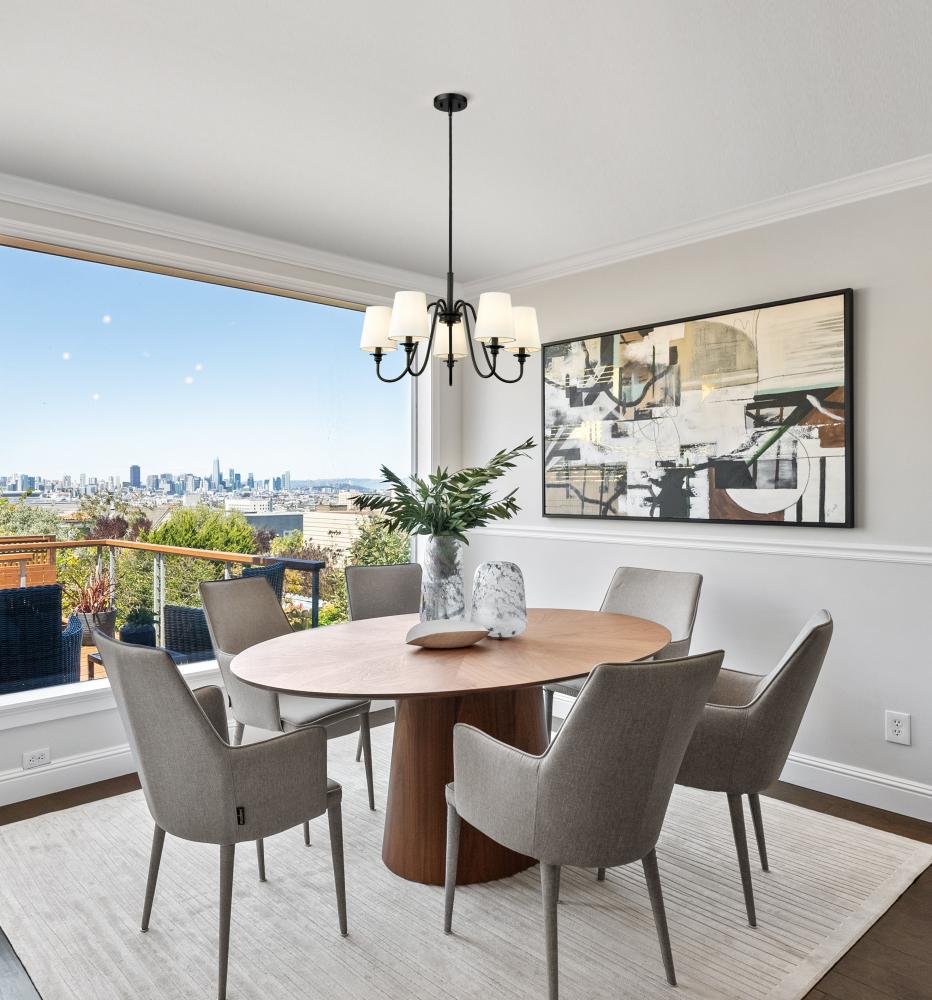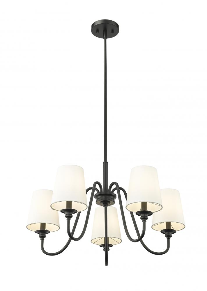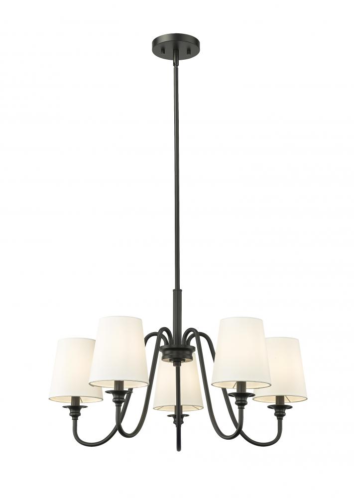 Swooping arms define the minimalist simplicity of a modern five-light chandelier. Its classic elegance is enhanced with classic candlestick styling paired with a rich matte black finish. Five shades are opaque white, offering diffused illumination and elegant ambiance over a dining table or living room sitting area.