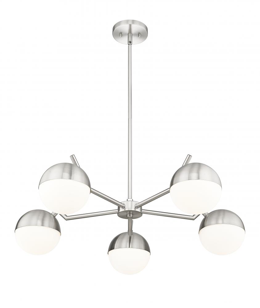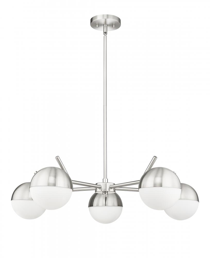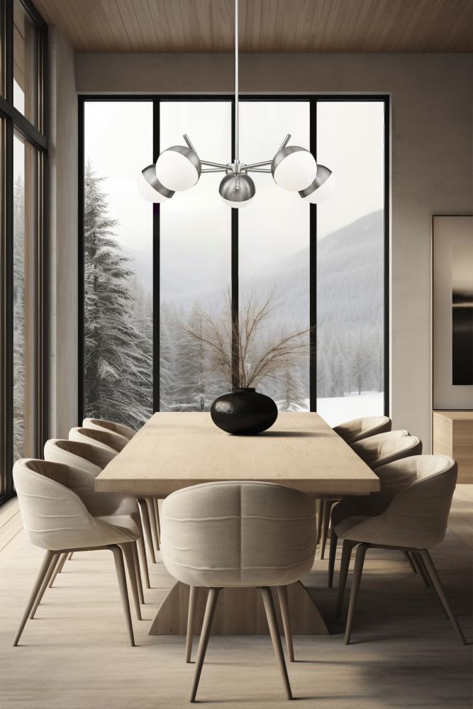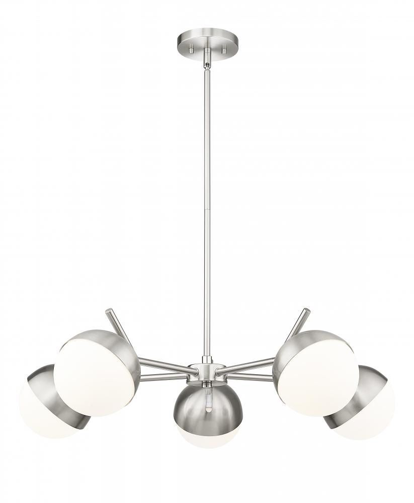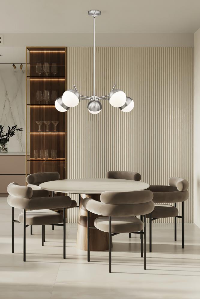 A radiant configuration of angular arms in a sleek brushed nickel finish create a compelling style for this modern five-light chandelier. Striking over a dining table or other gathering space, it features a clean, straight-lined silhouette and is complete with opal glass orb shades for inviting illumination.