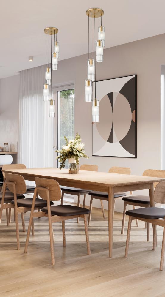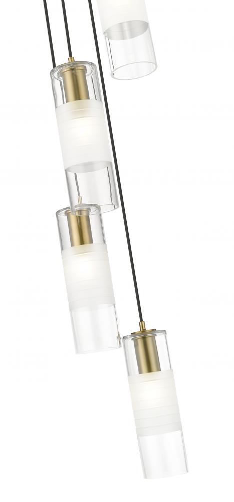 A spiraling fall of five lights create a chic presentation for a modern chandelier. From the Alton collection, it boasts substantial housings and a round canopy, all in a sophisticated modern gold finish. Artisan clear and frosted glass creates a chic shade, diffusing illumination to create a welcoming ambiance in your foyer or living room.