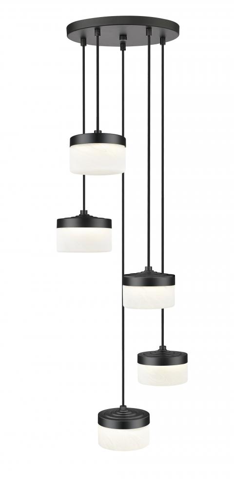 Gathered around a round canopy, this matte black 5-light LED chandelier arranges its clouded glass shades at varied heights to create a playful, layered silhouette over the space. The clustered composition suits smaller dining areas, lounge corners, or compact foyers where you want notable personality without visual clutter. Bright, adjustable LEDs keep the scene functional for board games and conversation, then mellow gracefully when it is time to unwind.