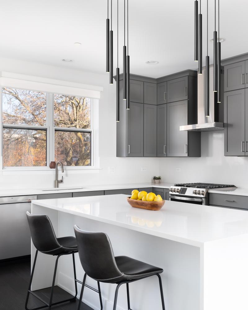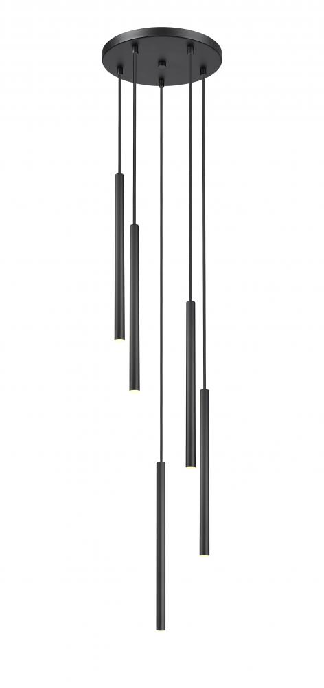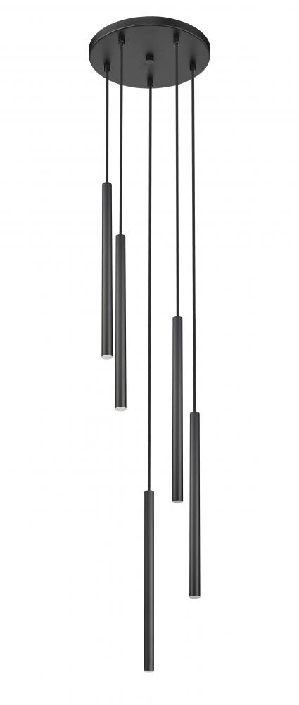 Chic staggered lights create a compelling, sculptural silhouette for this modern five-light chandelier. It features integrated LEDs tucked in long, slim shades, all with a chic matte black finish. The light is dimmable and energy efficient, perfect for a stylish living or dining room.