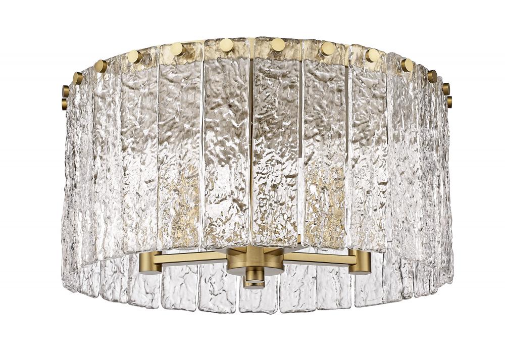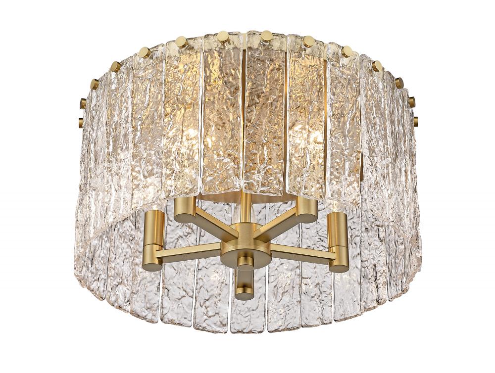 Choose lighting that speaks to the striking artistic design scheme chosen for impact in a modern or transitional space. The Glacier round five-light flush mount ceiling light offers a decadent look of individual clear textured glass panels that emulate melting ice, an extraordinary effect with dramatic impact in a kitchen or bar area. Modern gold finish steel is placed as a crown frame, adding a consistency in palette and motif and embellishing the gallery feel of a kitchen or entryway with both natural and industrial inspiration.