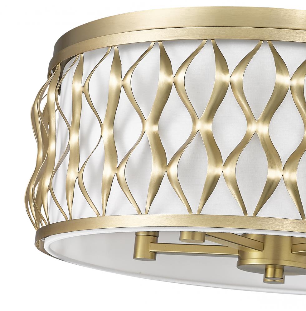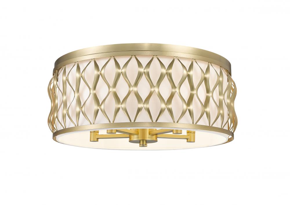 Embrace an iconic style motif in a sculptural and fashion-forward five-light flush mount ceiling light constructed of elegant modern gold finish steel. Living rooms, dining spaces, and foyers receive a timeless aesthetic with a drum-shaped fixture featuring symmetrical ribbon waves cascading vertically, banded on both edges. A white diffuser filters glowing light, creating superb optical ergonomics.