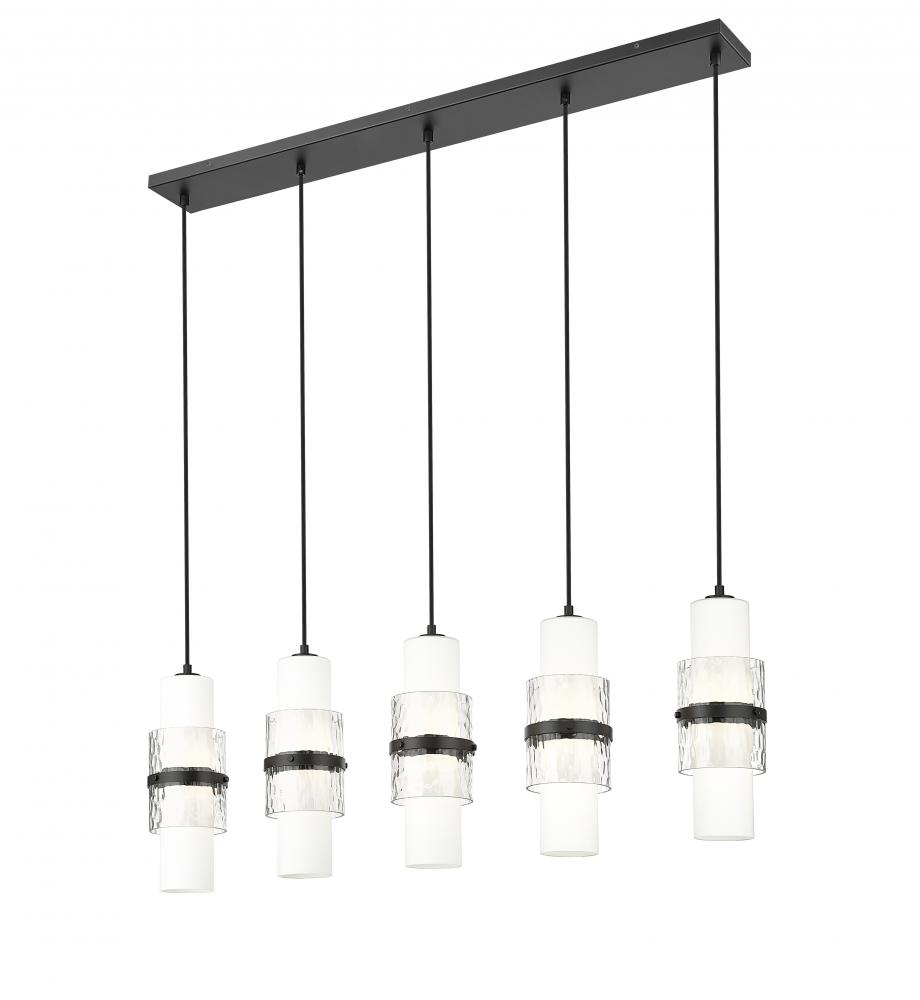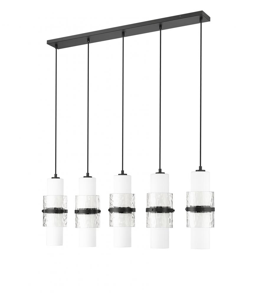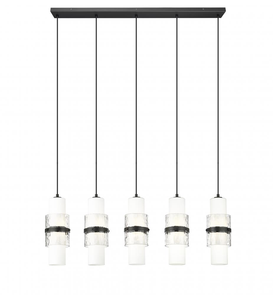 Put a sophisticated spin on an inviting kitchen with this modern five-light island chandelier. In a matte black finish, it boasts a slim canopy and braided cloth covered cords, with a single row of delicate shades. Each features a center cylinder of etched opal glass complemented with clear textured glass that creates dimension and a metal cuff that adds artistry and elegance.