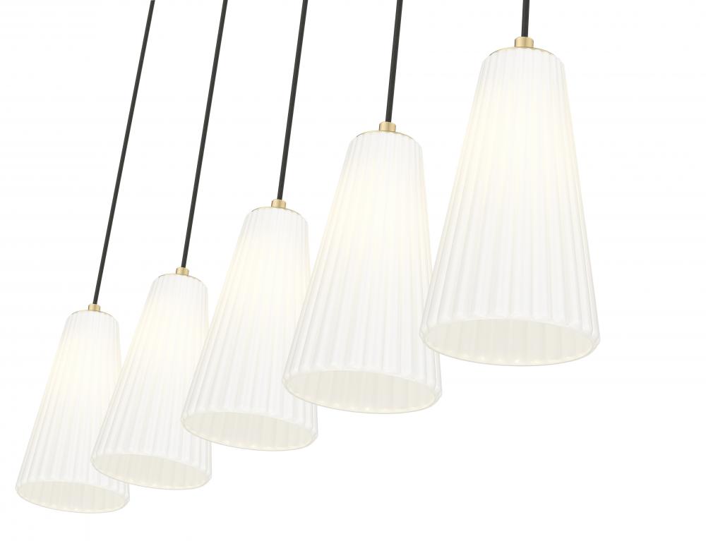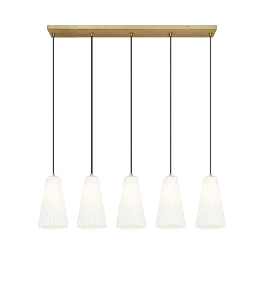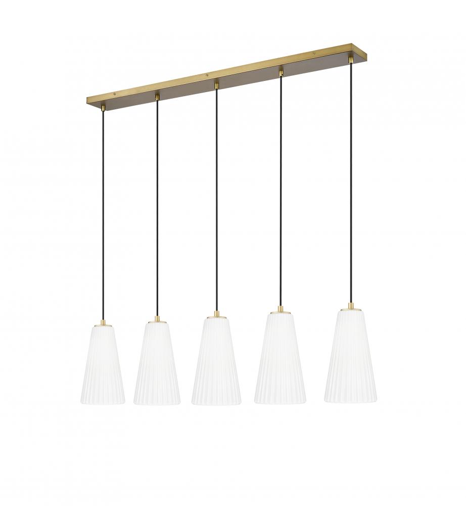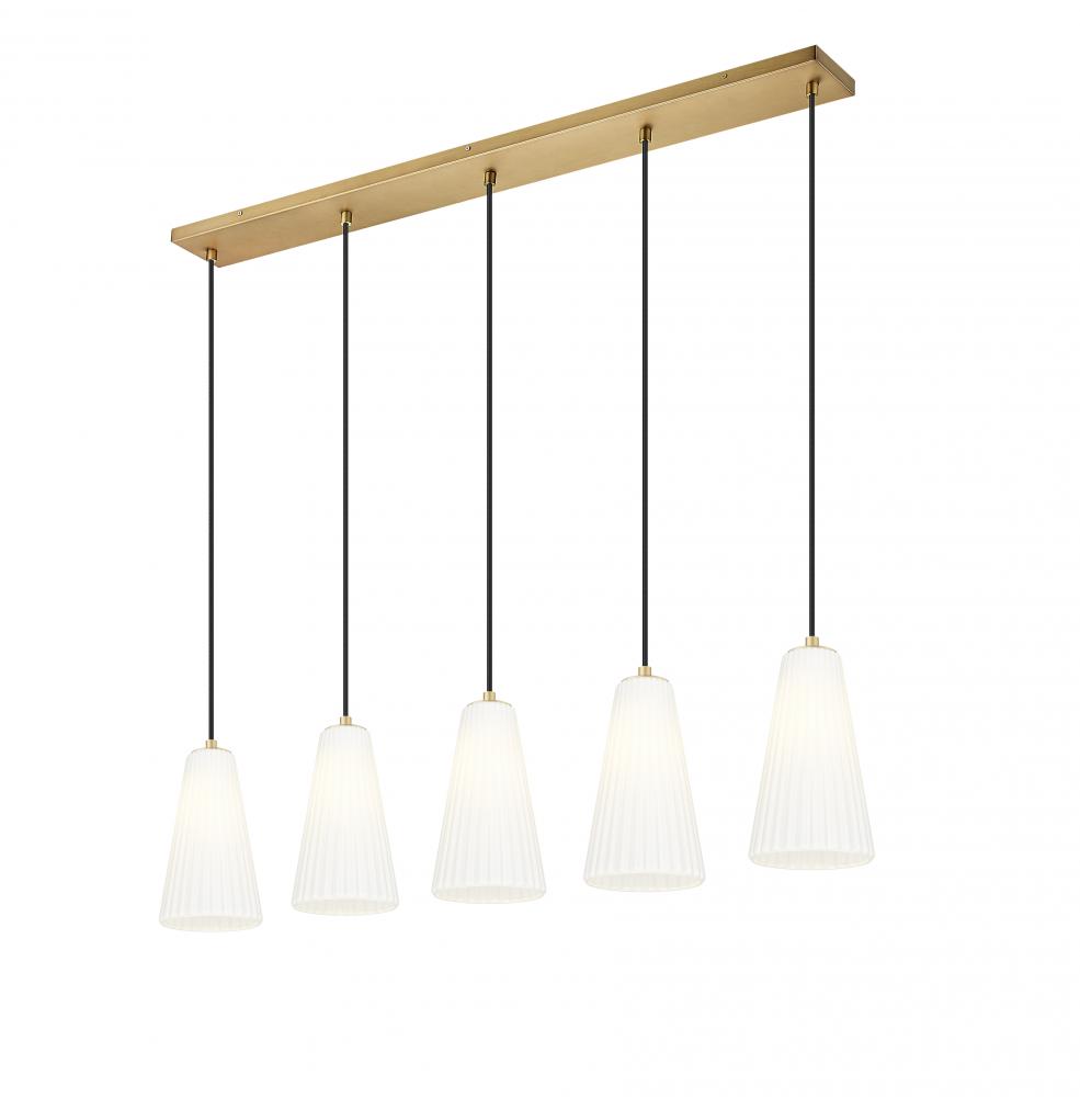 A modern gold finish imparts welcoming warmth in a modern five-light linear chandelier. From the Farrell collection, its a balanced presentation of five elongate, conical shades crafted from fluted frosted glass that softens downlighting to create a rich, inviting glow over your kitchen island or dining table.